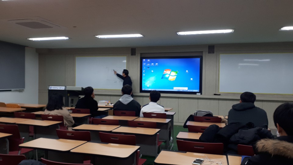 자동차에 관련된 강의(이론)를 듣고 있는 모습이다.
