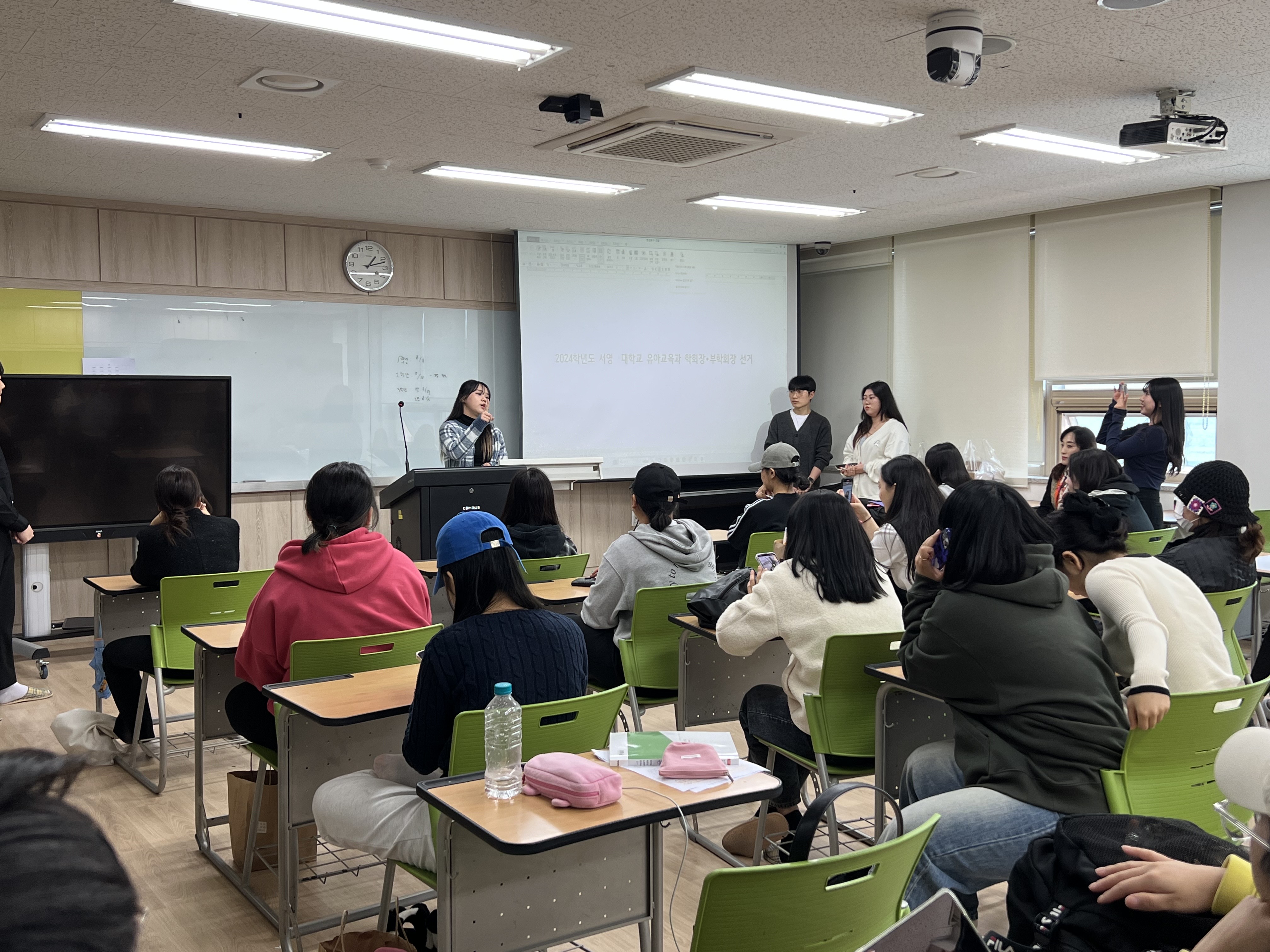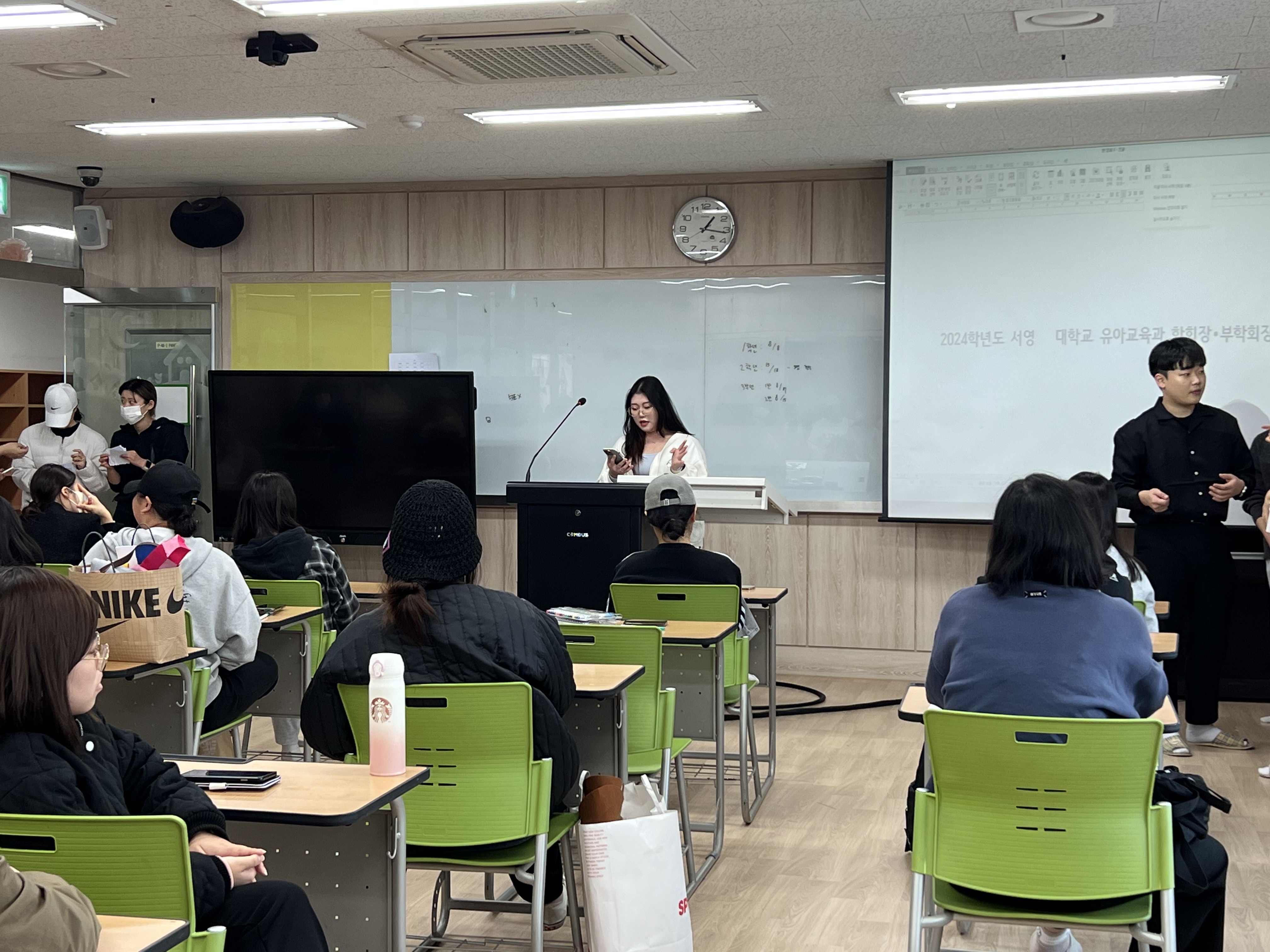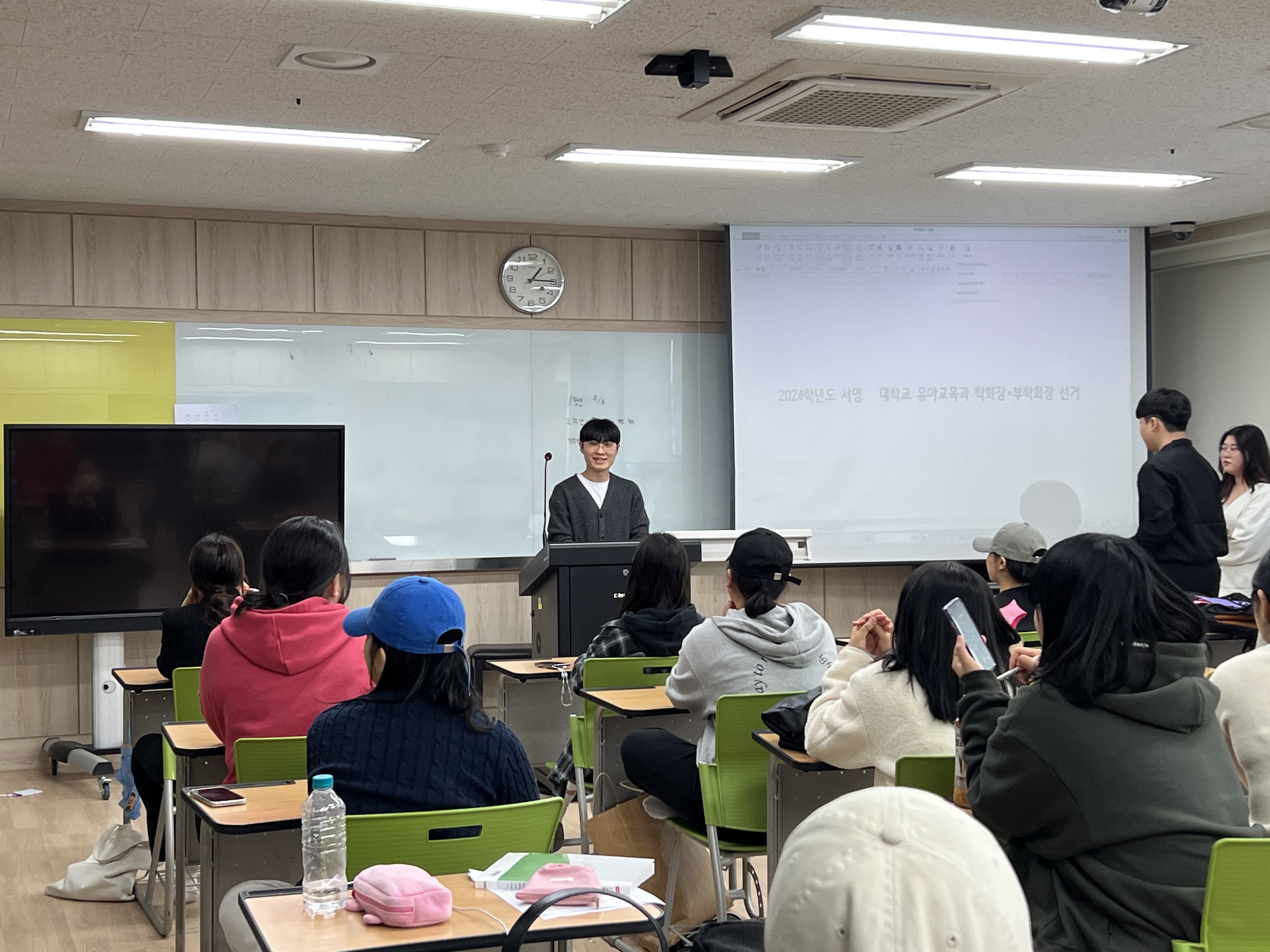 - 내용 : 10월 31일, 서영대학교 유아교육과 선거관리위원회 주관 '2024학년도 학회장, 부학회장 선거'를 진행하였습니다. 투표 결과는 학년별 단톡을 확인해주시기 바랍니다. 투표에 참여해주신 1,2,3학년 재학생 여러분들께 감사인사 전하며, 2024학년도 서영대학교 유아교육과를 이끌어 갈 예비 학회장, 부학회장에게 많은 축하와 격려 바랍니다.