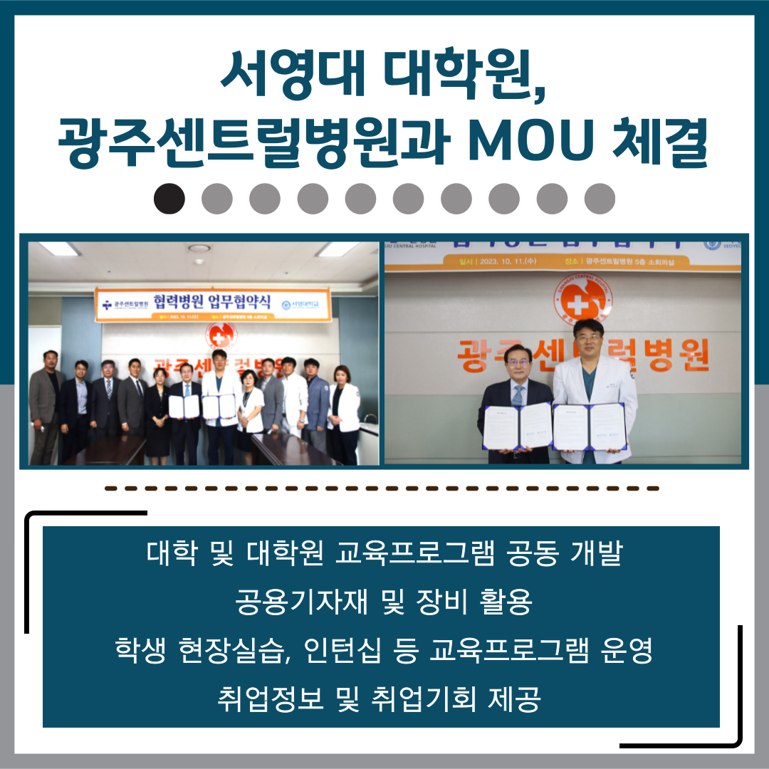 ○서영대학교(총장 김정수)는 10월 11일 광주센트럴병원과 산학 MOU를 채결하였다. ○이번 협약을 통해 양 기관은▲대학 및 대학원 교육프로그램 공동 개발▲공용기자재 및 장비 활용▲학생 현장실습,인턴십 등 교육프로그램 운영▲취업정보 및 취업기회 제공 등을 위해 협력하기로 하였다. ○박정수 서영대 대학원장은“두 기관의 역량과 자원을 바탕으로 광주시 보건·의료분야의 발전과 우수인재 양성을 위한 모범적인 산학협력 체계를 구축하겠다”며“이를 바탕으로 인공지능기반 재활운동치료,스마트진단검사분석 등 보건·의료분야의 우수한 현장 실무형 석사 인재를 양성할 것”이라고 전했다. ○고길석 광주센트럴병원 대표원장은 “광주센트럴병원은 광주시의 중심이 되는 의료기관으로서 진료,교육,연구,봉사,나눔 등 다양한 영역에서 활발히 활동 중이다”며“지역사회와 국가,더 나아가 인류의 건강한 삶에 기여하는데 서영대와 그 뜻을 같이 하게 돼 기쁘다”고 말했다. ○한편,광주센트럴병원은 지난3월 종합병원으로 승격하여 정형외과,내과,신경외과,신경과 등14개 진료과30명의 전문의가 진료를 하고 있으며,진료분야를 세분화하여 전문적인 진료를 받으실 수 있도록 관절센터, 척추센터, 심장센터, 당뇨병센터를 비롯해 종합검진센터, 인공신장센터, 호스피스병동 등을 운영하고 있다.