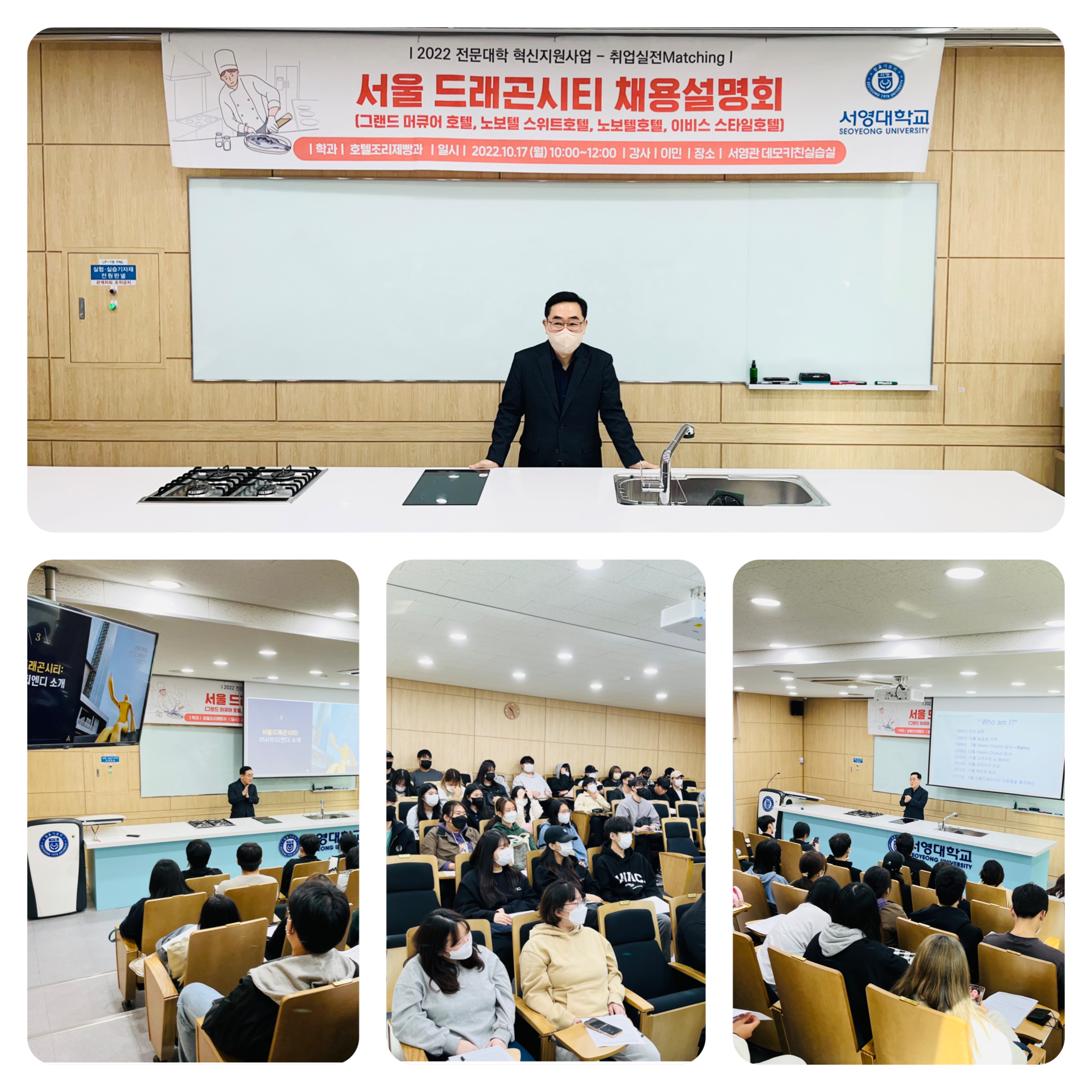 ○호텔조리제빵과(학과장 권기완)는 학생들의 다양한 취업처 확보를 위해 국내에서 가장 규모가 큰 서울 용산에 있는 드래곤시티(그랜드머큐어호텔, 노보텔스위트호텔, 노보텔호텔, 이비스스타일호텔)호텔의 이민 총지배인님을 모시고 채용설명회를 진행하였습니다.