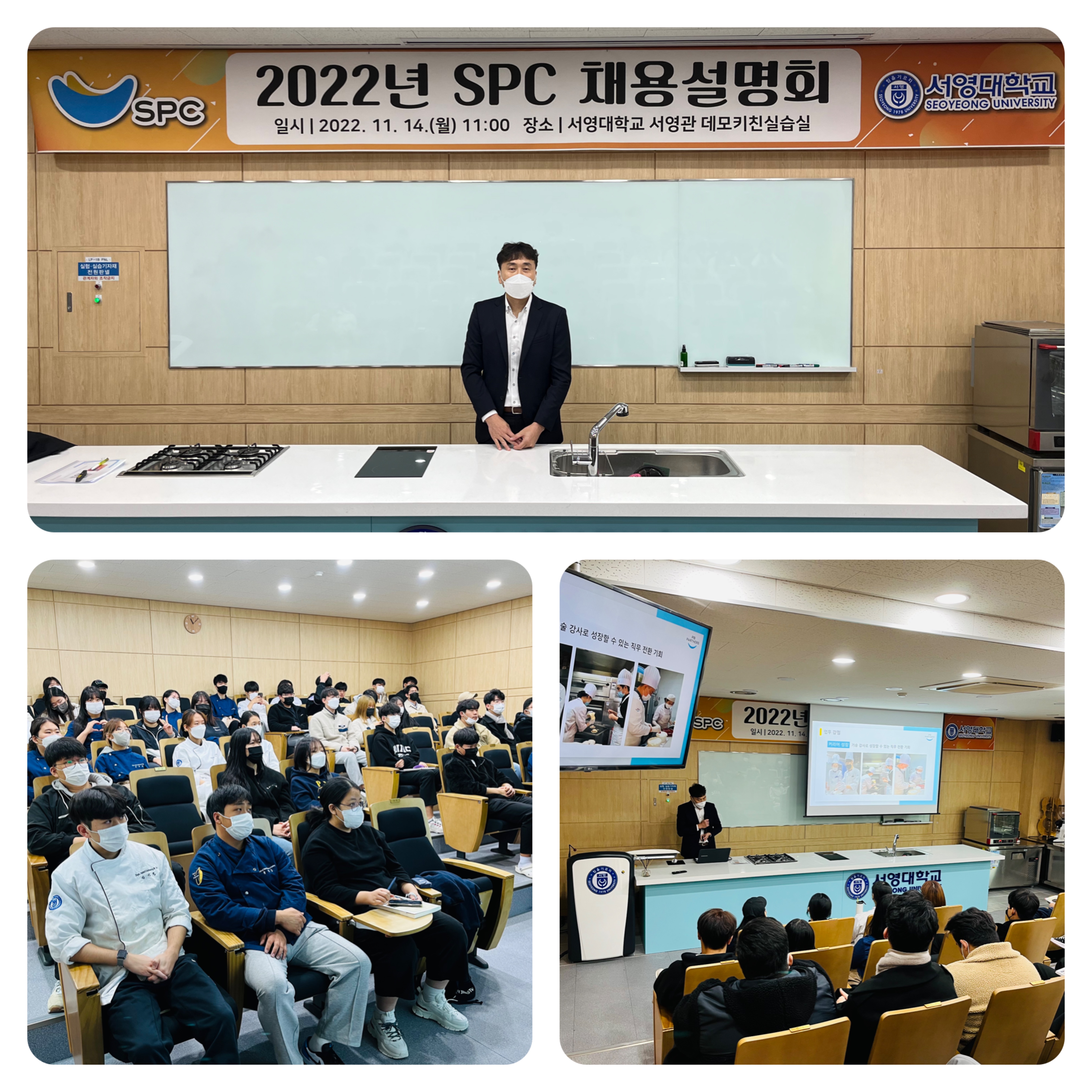 ○ 호텔조리제빵과(학과장 권기완)는 11월14일 서영관 데모키친실습실에서 재학생 60여명을 대상으로 ‘2022 SPC 신입사원 채용설명회’를 실시하였다.