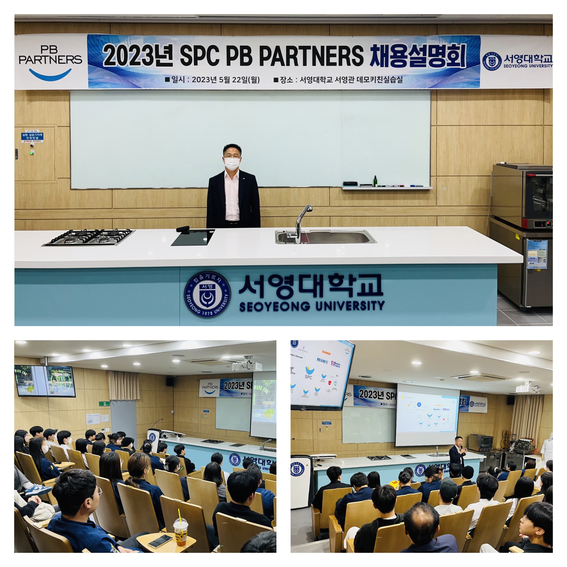 ○ 5월 22일 교내 서영관 데모키친실습실에서 호텔조리제빵과 재학생 50명을 대상으로 SPC PB PARTNERS 채용설명회를 가졌다. ○ SPC PB PARTNERS는 SPC그룹의 유럽풍 베이커리를 표방하며 베이커리 시장을 선도하는 PARIS BAGUETTE 프리미엄 브랜드의 기능인력 육성 및 관리하는 회사로 매년 다양한 분야에 호텔조리제빵과와 협력 프로모션을 진행하고 있다. ○ SPC 인사 담당자는 “호텔조리제빵과 학생들은 수준 높은 실습수업과 인성교육을 통해 기술적인 부분만 아니라 인성적으로도 우수한 자원이다“ 며 ”전공에 대한 열정이 가득하고 성실·근면한 호텔조리제빵과 학생들에게 전문가로서 성장할 수 있도록 취업기회를 지속적 서비스 하겠다”고 밝혔다. ○ 호텔조리제빵과 학과장 권기완교수는 “국내 베이커리 기업의 선두주자인 SPC 인사담당자의 교내 채용설명회 개최로 재학생들이 기업에 대한 비전과 전망을 직접 듣게 되는 매우 뜻깊은 자리라고 생각된다.” 며 “향후에도 많은 기업들의 채용설명회를 유치하여 서영대학교 호텔조리제빵과가 명품 취업중심학과로 자리매김 하는데 기여하겠다.”고 전했다.