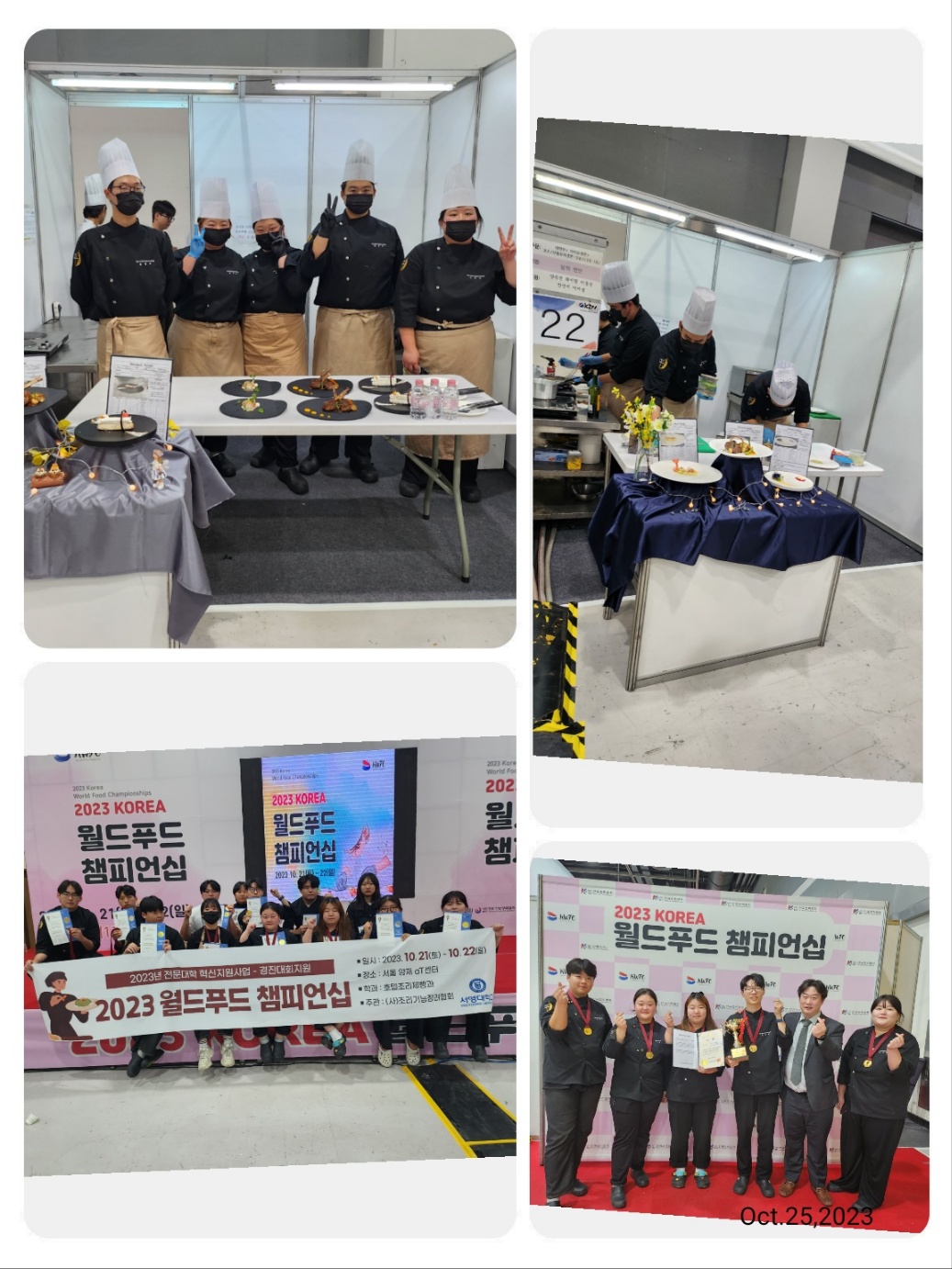 ○우리대학 호텔조리제빵과는 지난21일 서울 양재동aT센터에서 열린‘2023 KOREA월드푸드 챔피언십’에서 대상(서울시장상)을 포함한 다수의 상을 수상했다. ○한국조리협회와 조리기능장려협회가 주최하고전국에서2,300여명이 출전한이번 요리경연대회는 하반기 국내 단일요리대회 중 최대 규모로 치러졌다. ○ 우리대학 호텔조리제빵과1학년 재학생14명은 학생 라이브 요리경연,개인 전시 부문 등에 참가해 대상(서울시장상) 1팀,금메달2팀,은메달1팀,동메달1팀 등 참가학생 전원이 수상의 영예를 안았다. ○서동건 호텔조리제빵과 학생은“요리대회 준비하는 과정에서 학교의 전폭적인 지원과 학과 교수님들의 응원 및 지도 덕분에 좋은 성과를 거뒀다”며“앞으로도 끊임없이 노력하고 개인의 역량을 높여 최고의 셰프로 성장하겠다”고 말했다. ○전도현호텔조리제빵과 학과장은“대회에 참가한 학생들이 중간고사,지역사회 봉사활동 등의 바쁜 일정 속에서도 요리경연을 위해 철저히 준비하는 과정을 지켜봤다”며“1학년임에도 최선의 노력으로 대학과 학과의 명예를 높인 학생들이 무척 자랑스럽다”고 전했다.