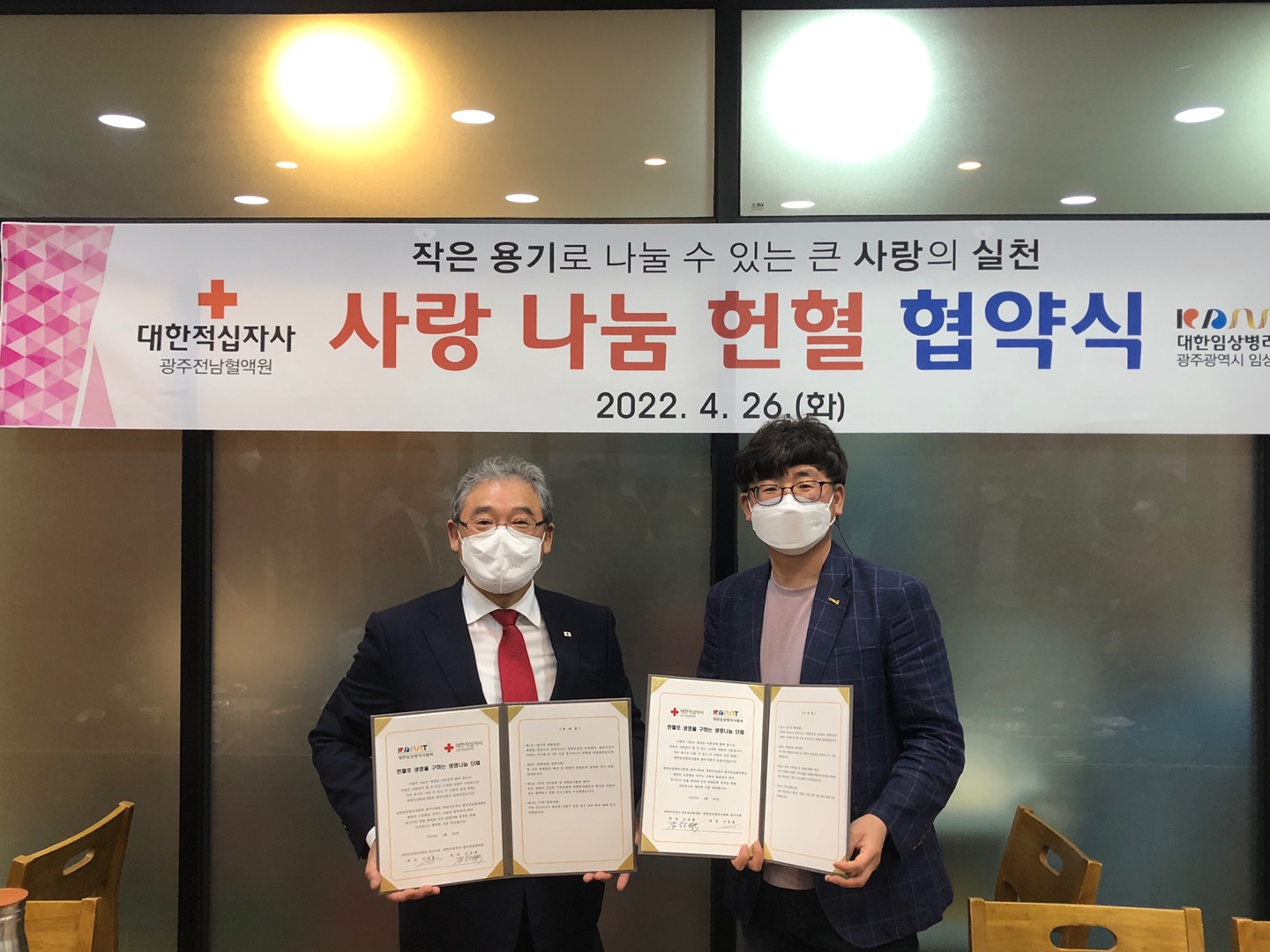 광주시 임상병리사협회는 22년 4월 26일 대한적십자사 광주전남혈약원과 '사랑나눔 헌혈 협약식'을 진행하였다 본 협약식에는 광주광역시 소재 임상병리과 학과가 있는 서영대학교, 광주보건대, 동강대 교수진과 학생대표가 참여해 더 뜻깊은 자리를 마련하였다