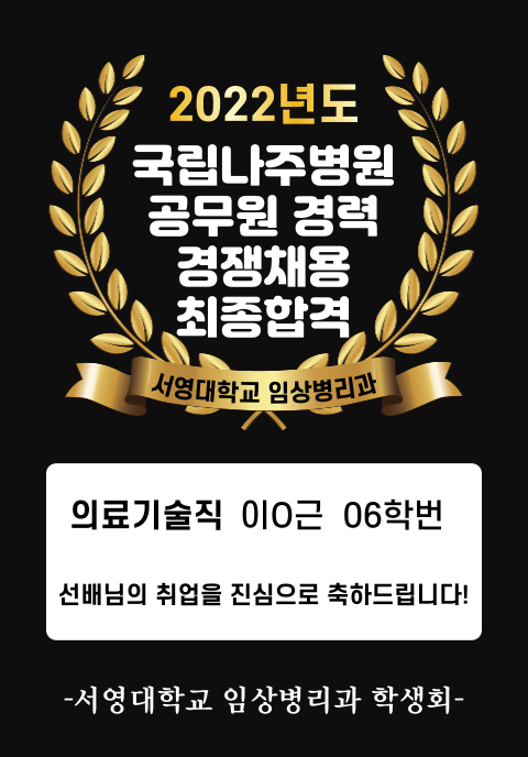 임상병리학과 06학번 졸업생 이O근학생이 국립나주병원 공무원 경력경쟁채용에서 최종합격하였습니다. 이번 이O근학생의 정규직 취업을 통해 임상병리과 재학생들에게는 임상병리사에 대한 미래 비전과 서영대학교 임상병리과의 저력을 과시한 쾌거로 생각되며 이O근학생은 " 모든 학과교수님들의 지도에 감사하며, 서영대학교 임상병리과의 이름에 누가 되지 않도록 매사에 최선을 다하겠다"며 "자기계발과 전문성을 위해 열심히 노력해 기회가 있다면 임상병리사를 꿈꾸는 후배 양성에 일조하고 싶다."라는 포부를 밝혔습니다. 서영대학교 임상병리과 파이팅!!!