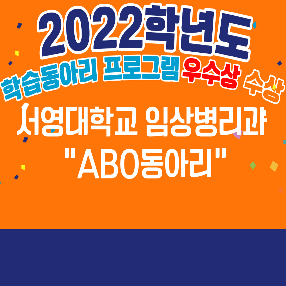 서영대학교 임상병리과ABO동아리 서영대학교 임상병리과ABO동아리(팀장 최윤우)가 교수학습지원센터에서 주관하는2022학년도 학습동아리 프로그램에 참여하여 우수상을 수상하였습니다.최윤우 학생의 수상소감으로는“학과에서 배운 이론지식을 직접 실험을 통해 경험해보니 신기하면서도 더욱더 전공학습활동에 필요성을 느길수 있어다며 향후 졸업후 진단검사의학과 취업할수 있는 역량을 키우기 위해 많은 노력을 해야겠다는 새로운 다짐을 하겠되었다”라고 전했다.임상병리과에서는 향후 다양한 프로그램에 참여하여 임상병리와 관련된 전공직무능력을 함양시키고 향후 해당 학생들이 실습의료기관으로 취업까지 연계될 수 있도록 지원할 계획이다.