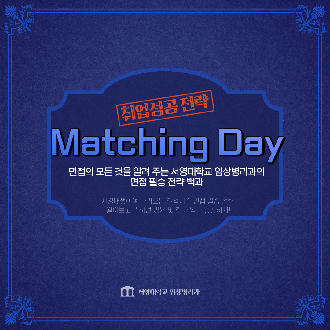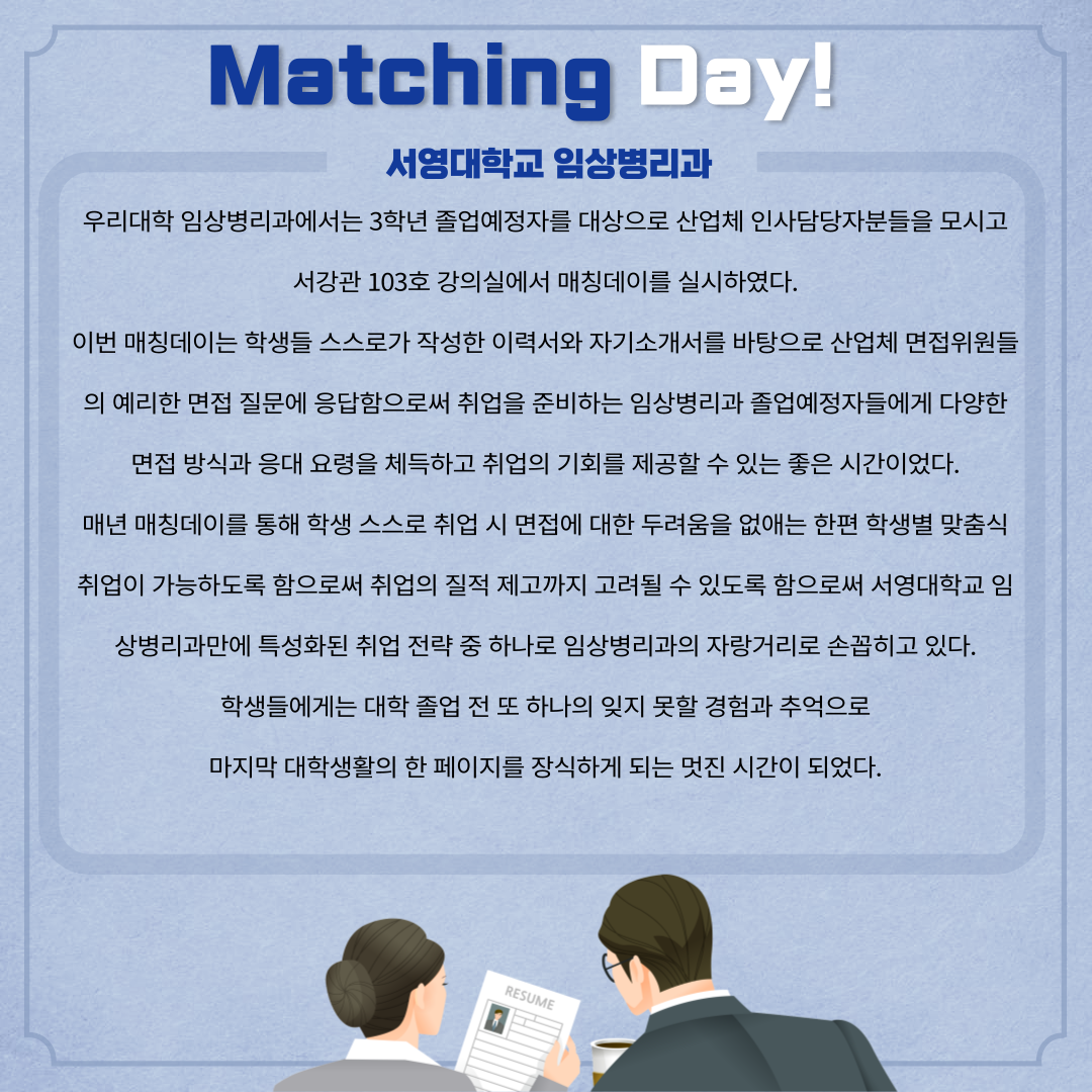 매년 매칭데이를 통해 학생 스스로 취업 시 면접에 대한 두려움을 없애는 한편 학생별 맞춤식 취업이 가능하도록 함으로써 취업의 질적 제고까지 고려될 수 있도록 함으로써 서영대학교 임상병리과만에 특성화된 취업 전략 중 하나로 임상병리과의 자랑거리로 손꼽히고 있다.