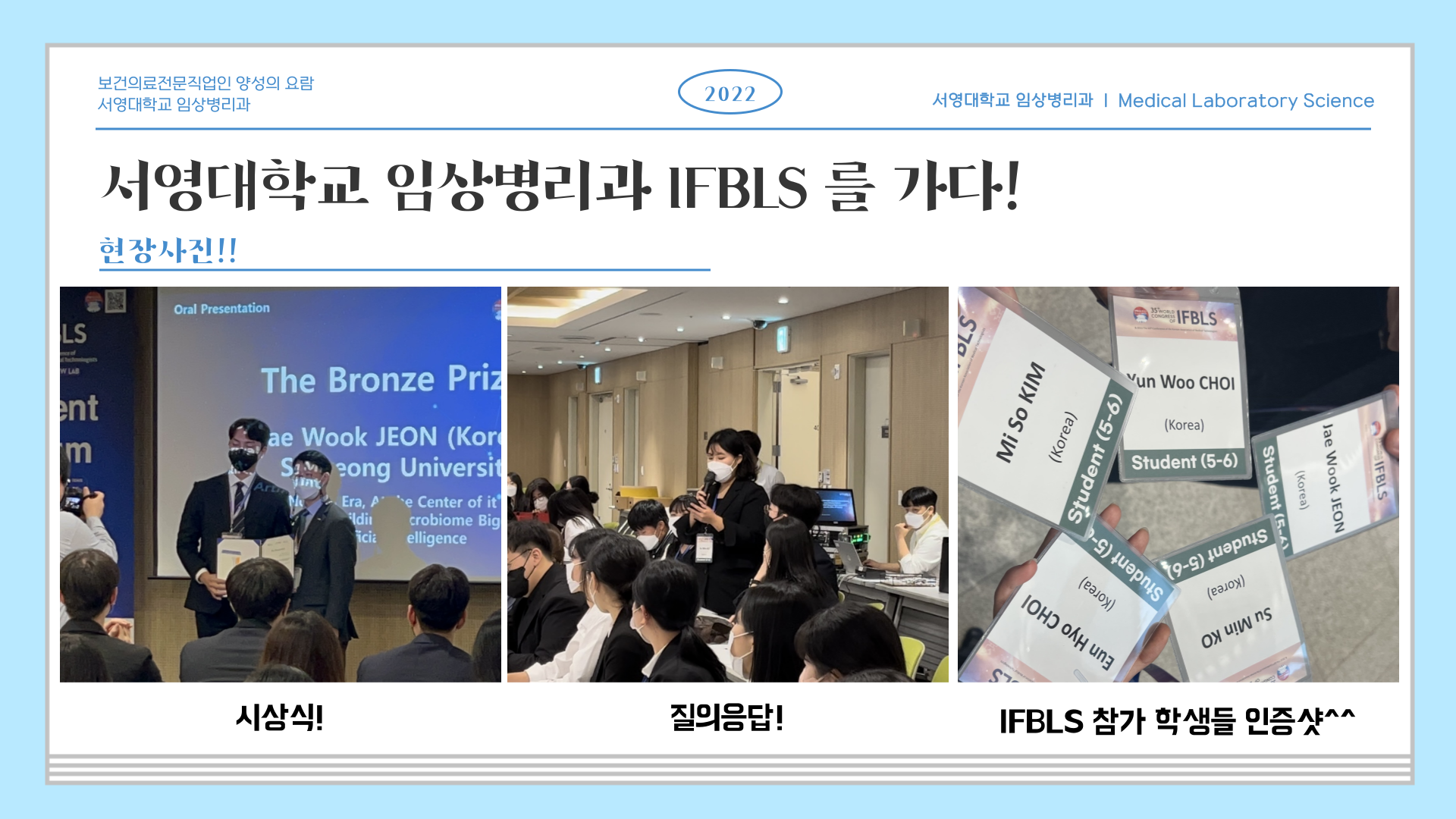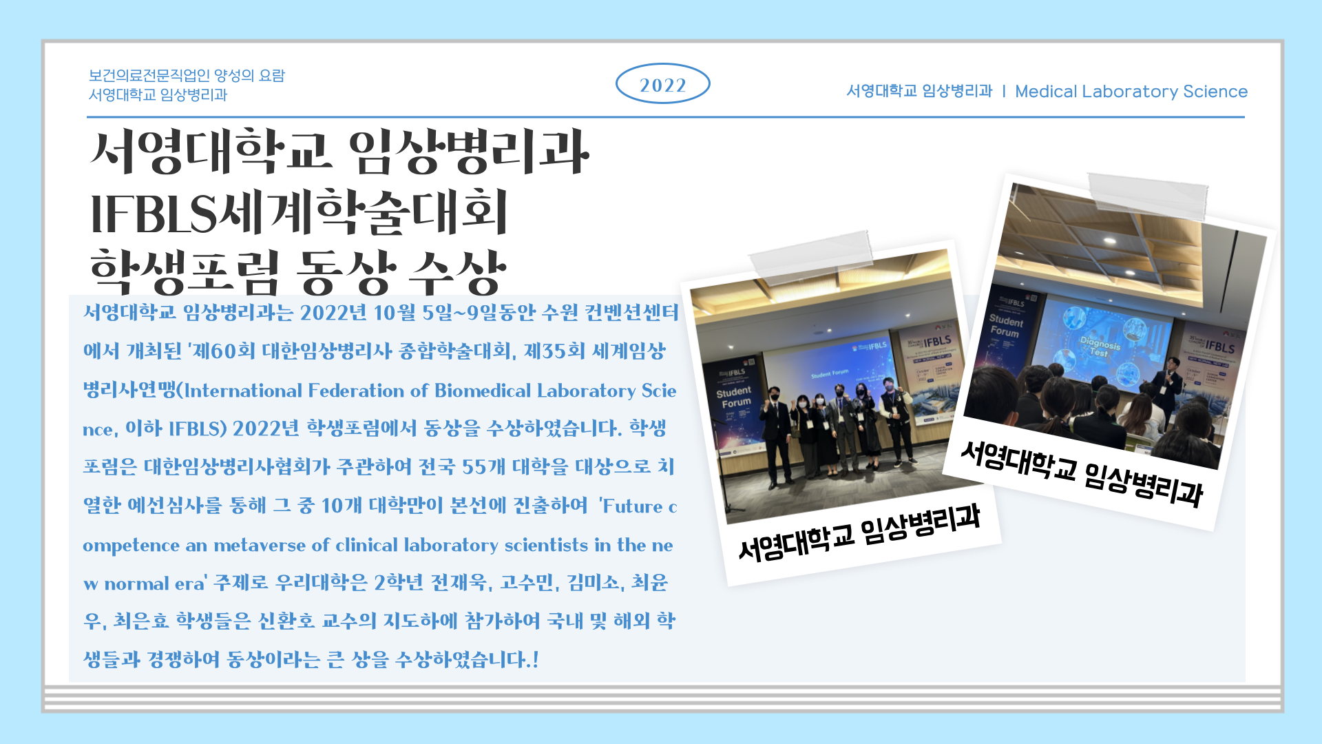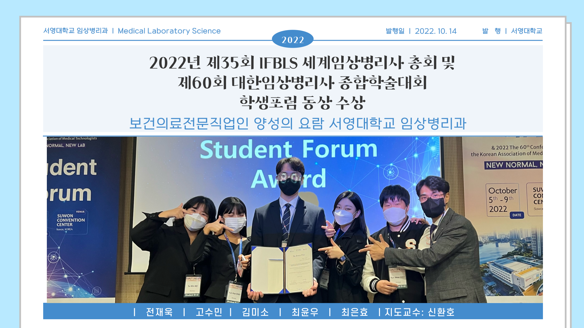 서영대학교 임상병리과는 2022년 10월 5일~9일동안 수원 컨벤션센터에서 개최된 ‘제 60회 대한임상병리사 종합학술대회, 제 35회 세계임상병리사연맹(International Federation of Biomedical Laboratory Science, 이하 IFBLS)’ 2022년 학생포럼에서 동상을 수상하였습니다. 학생포럼은 대한임상병리사협회가 주관하여 전국 55개 대학을 대상으로 치열한 예선심사를 통해 그 중 10개 대학만이 본선에 진출하여 ‘Future competence an metaverse of clinical laboratory scientists in the new normal era’ 주제로 우리대학은 2학년 전재욱, 고수민, 김미소, 최윤우, 최은효 학생들은 신환호 교수의 지도하에 참가하여 국내 및 해외 학생들과 경쟁하여 동상이라는 큰 상을 수상하였습니다.!