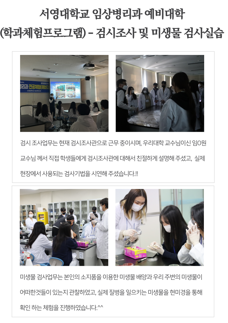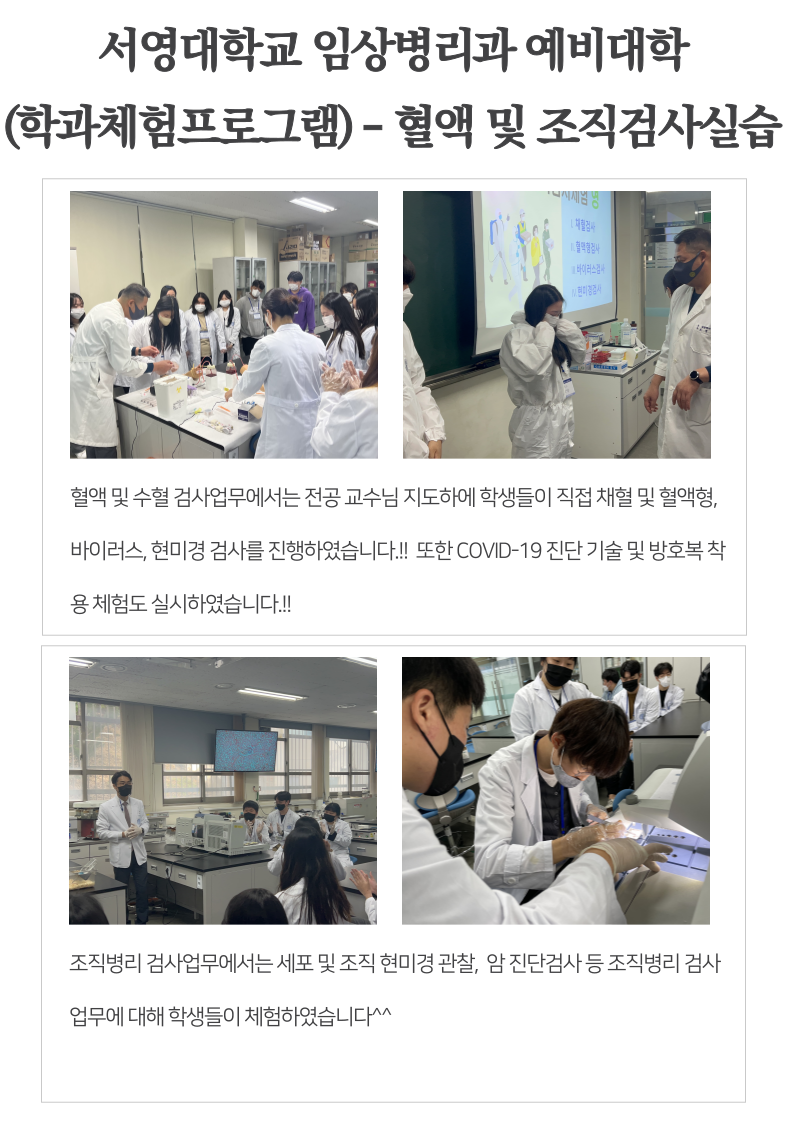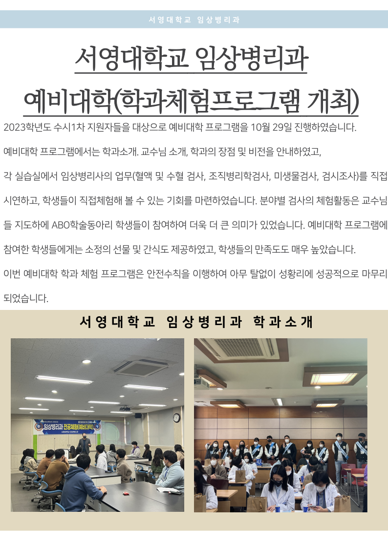 2023학년도 수시1차 지원자들을 대상으로 예비대학 프로그램을 10월 29일 진행하였습니다. 예비대학 프로그램에서는 학과소개, 교수님 소개, 학과의 장점 및 비전을 안내하였고, 각 실습실에서 임상병리사의 업무(혈액 및 수혈 검사, 조직병리학검사, 미생물검사, 검시조사)를 직접 시연하고, 학생들이 직접 체험해 볼 수 있는 기회를 마련하였습니다. 분야별 검사의 체험활동은 교수님들 지도하에 ABO 학술동아리 학생들이 참여하여 더욱 더 큰 의미가 있었습니다. 예비대학 프로그램에 참여한 학생들에게는 소정의 선물 및 간식도 제공하였고, 학생들의 만족도도 매우 높았습니다. 이번 예비대학 학과 체험 프로그램은 안전수칙을 이행하여 아무 탈 없이 성황리에 성공적으로 마무리 되었습니다. 참여해주신 학생분들 에게 진심으로 감사드리며, 이번 예비대학 프로그램 진행 준비부터 마무리까지 고생하신 학과교수님들, 학생회 임원진들, 참여한 ABO 학술동아리 학생들 모두 감사드리고, 수고하셨습니다. 서영대학교 임상병리과 화이팅!!!