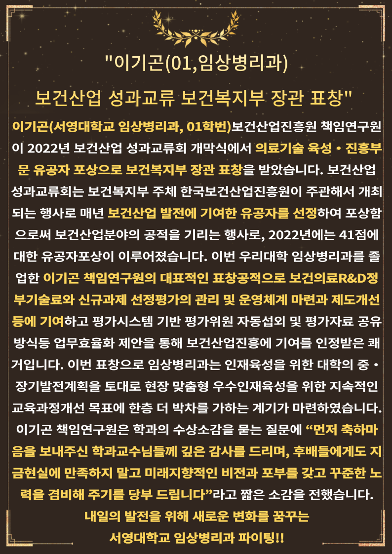 이기곤(서영대학교 임상병리과, 01학번) 보건산업진흥원 책임연구원이 2022년 보건산업 성과교류회 개막식에서 의료기술 육성·진흥부문 유공자 포상으로 보건복지부 장관 표창을 받았습니다. 보건산업성과교류회는 보건복지부 주체 한국보건산업진흥원이 주관해서 개최되는 행사로 매년 보건산업 발전에 기여한 유공자를 선정하여 포상함으로써 보건산업분야의 공적을 가리는 행사로, 2022년에서 41점에 대한 유공자포상이 이루어졌습니다.