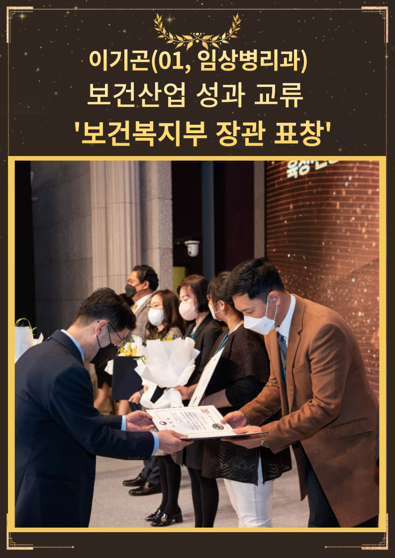 이번 우리 대학 임상병리과를 졸업한 이기곤 책임연구원의 대표적인 표창 공적으로 보건의료 R&D 정부기술료와 신규과제 선정평가의 관리 및 운영체계 마련의 제도개선 등에 기여하고 평가시스템 기반 평가위원 자동섭외 및 평가자료 공유방식 등 업무효율화 제안을 통해 보건산업진흥에 기여를 인정받은 쾌거입니다.
