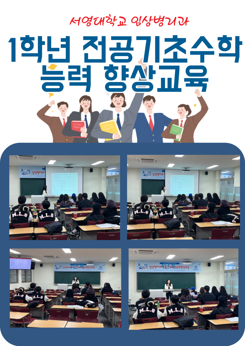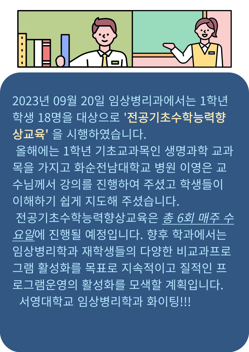 2023년 09월 20일 임상병리과에서는 1학년 학생 18명을 대상으로 '전공기초수학능력향상교육' 을 시행하였습니다. 올해에는 1학년 기초교과목인 생명과학 교과목을 가지고 화순전남대학교 병원 이영은 교수님께서 강의를 진행하여 주셨고 학생들이 이해하기 쉽게 지도해 주셨습니다.전공기초수학능력향상교육은 총 6회 매주 수요일에 진행될 예정입니다. 향후 학과에서는 임상병리학과 재학생들의 다양한 비교과프로그램 활성화를 목표로 지속적이고 질적인 프로그램운영의 활성화를 모색할 계획입니다. 서영대학교 임상병리학과 파이팅!!!