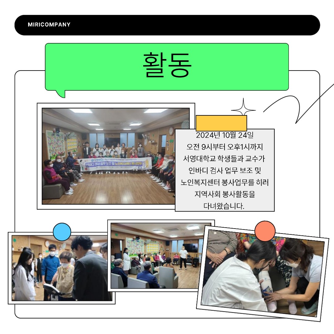 2024년 10월 24일 임상병리과 1학년 미생물 전공동아리 회원 4명의 학생들이 신바람노인복지센터를 방문하여 어르신 건강검사보조와 봉사활동을 실시하였습니다. 이번 봉사활동은 매년 정기적으로 주간보호센터에 계시는 노인분들을 위한 임상병리과만의 자원봉사활동으로 지역주민들과 함께 학생들의 인성함양을 위한 뜻깊은 행사로 진행하고 있습니다. 이번 봉사활동은 어르신의 건강을 위해 인바디 검사와 노인 복지프로그램 보조 등 다양한 활동으로 진행되었습니다.