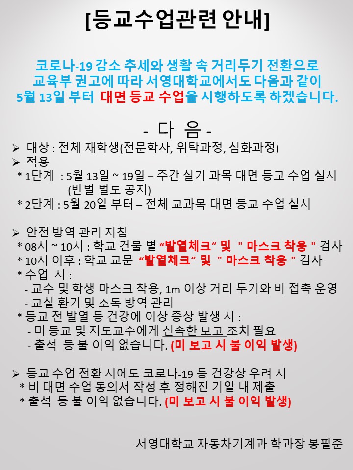 상기와 같이 등교수업 예정입니다. 또한 등교수업을 원칙으로 합니다. 기타 사항 등은  꼭 참고 부탁드립니다.