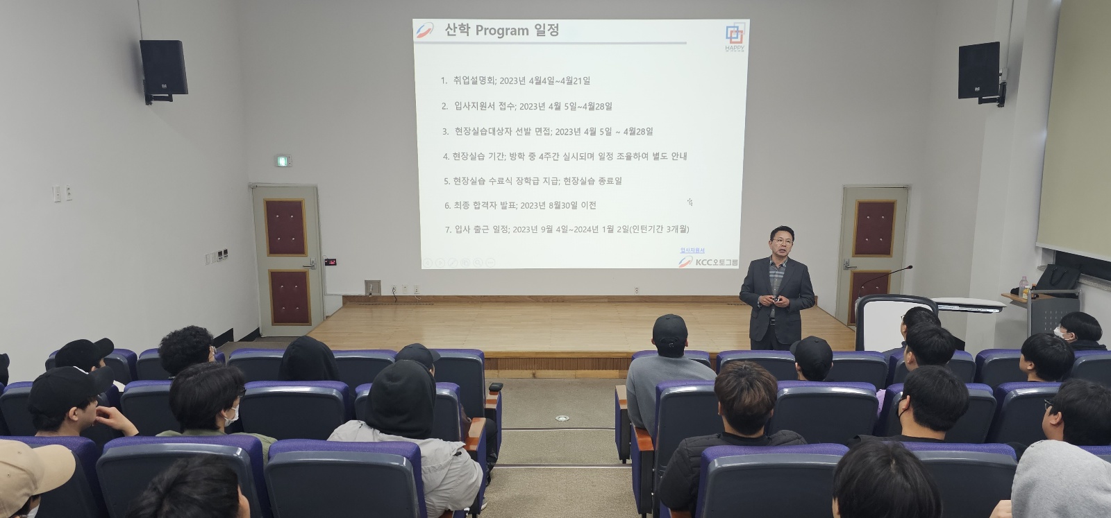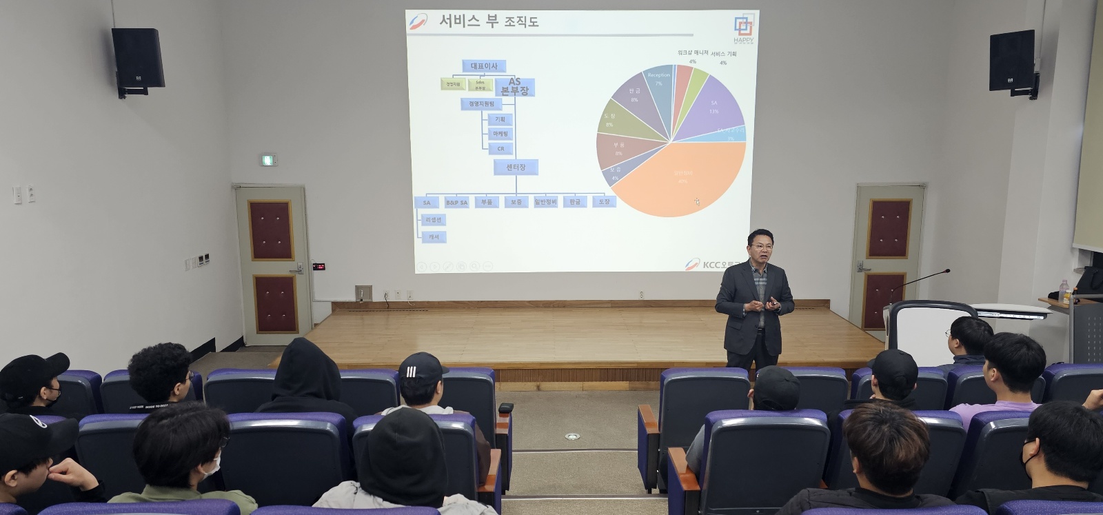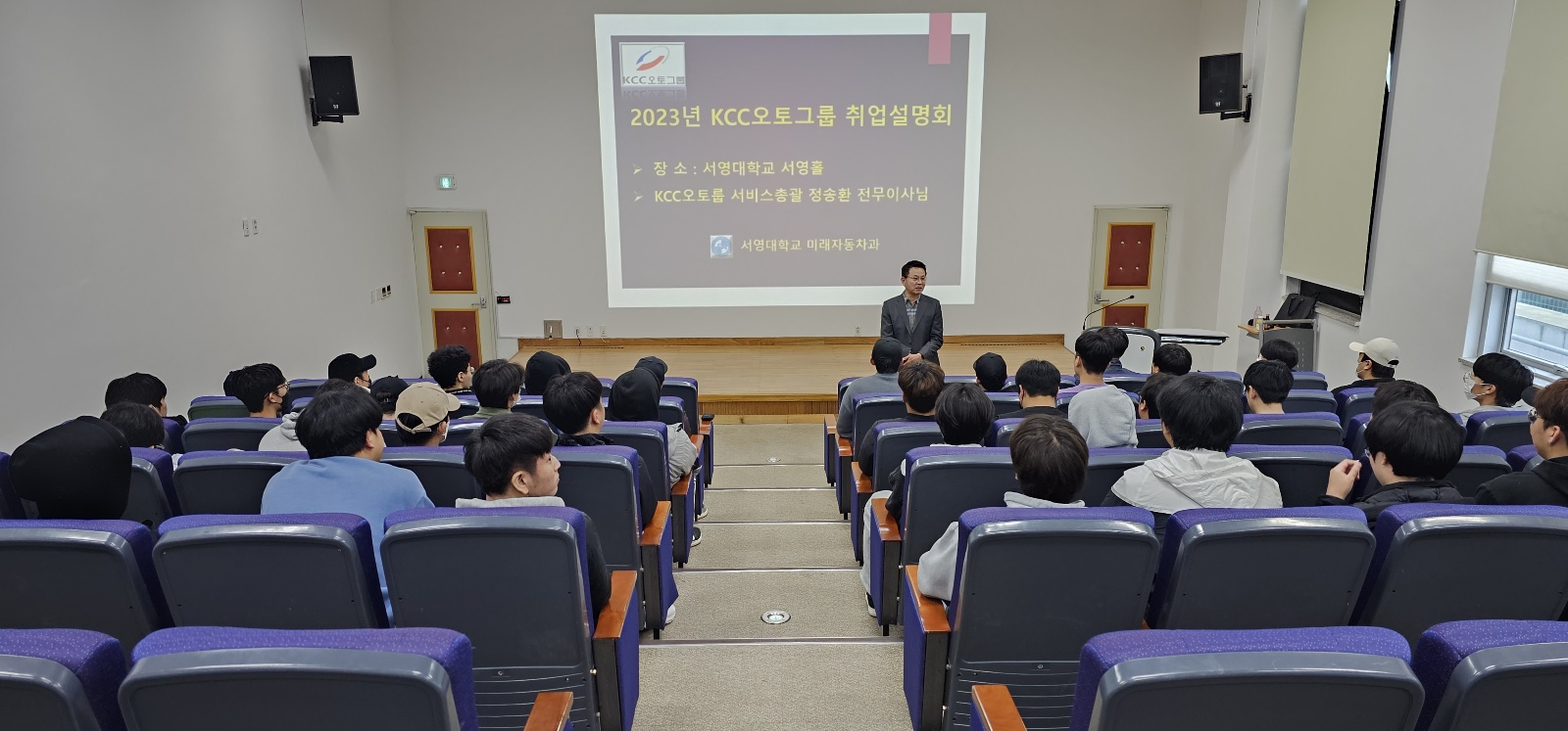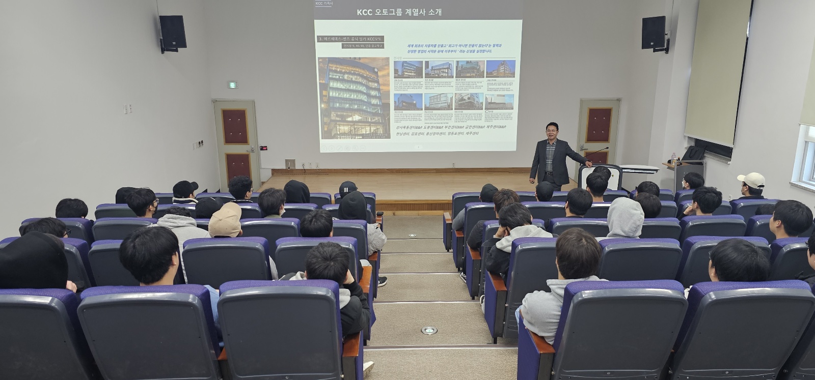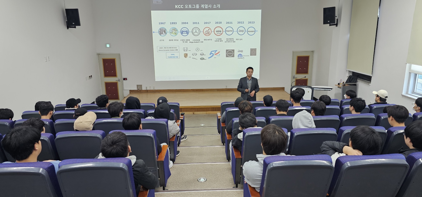 KCC오토그룹 서비스 총괄 정 * 환 전무이사님께서 본교 미래자동차과 재학생들을 위한 특강을 하셨습니다. KCC오토그룹은 벤츠, 포르쉐, 혼다, 닛산/인피니티, 재규어/랜드로버, 지프, 푸조 등 7개 브랜드의 서비스센터를 운영하고 있으며