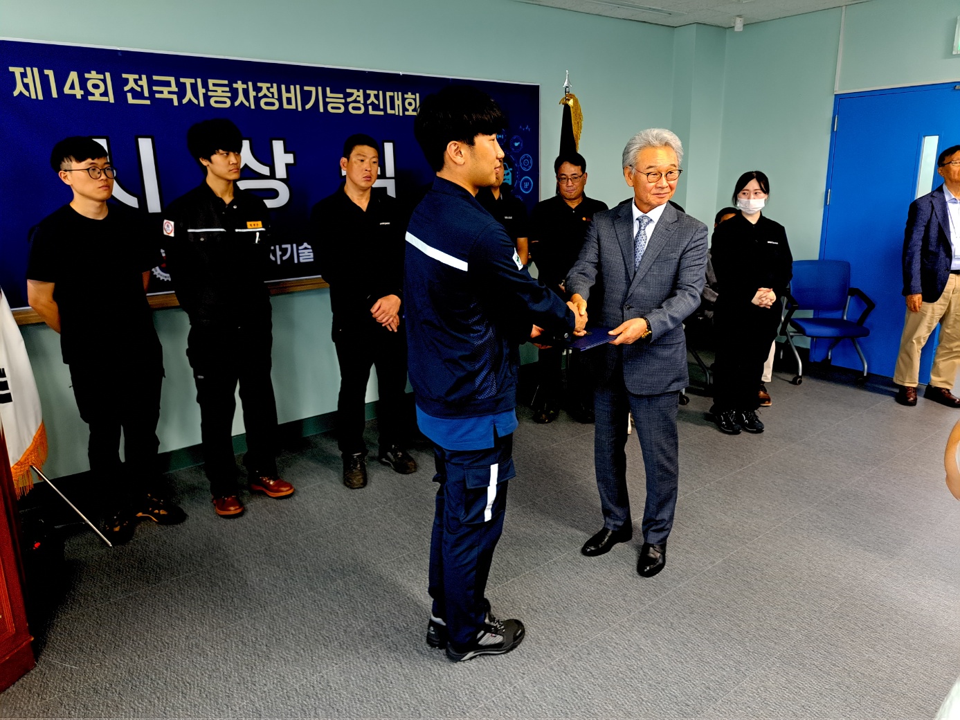 2023년 9월 16일부터 17일까지 정수폴리텍 대학에서 진행된 자동차 정비인들이 기능을 겨루는 제 14회 전국자동차정비 기능경진대회에서 서영대학교 미래자동차과 전문학사 졸업 후 한국공항에 취업하고 4학년에 재학 중인 김 ☆ 환군이 제 14회 전국자동차정비기능경진대회에서 장려상을 수상하였습니다. 서영대학교 미래자동차과는 지난 제 13회 대회에 이어 2년 연속 입상하는 쾌거를 이루었습니다. 많은 노력과 훈련을 통해 우리 대학 미래자동차과 산업체 재학생들이 출전해 우수한 성과를 거두어 미래자동차과를 빛내게 되었습니다.