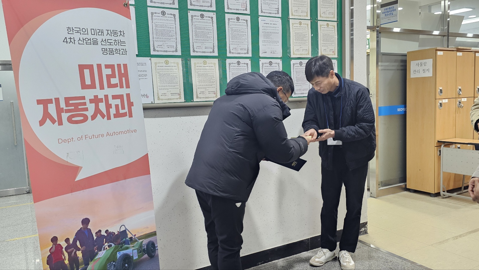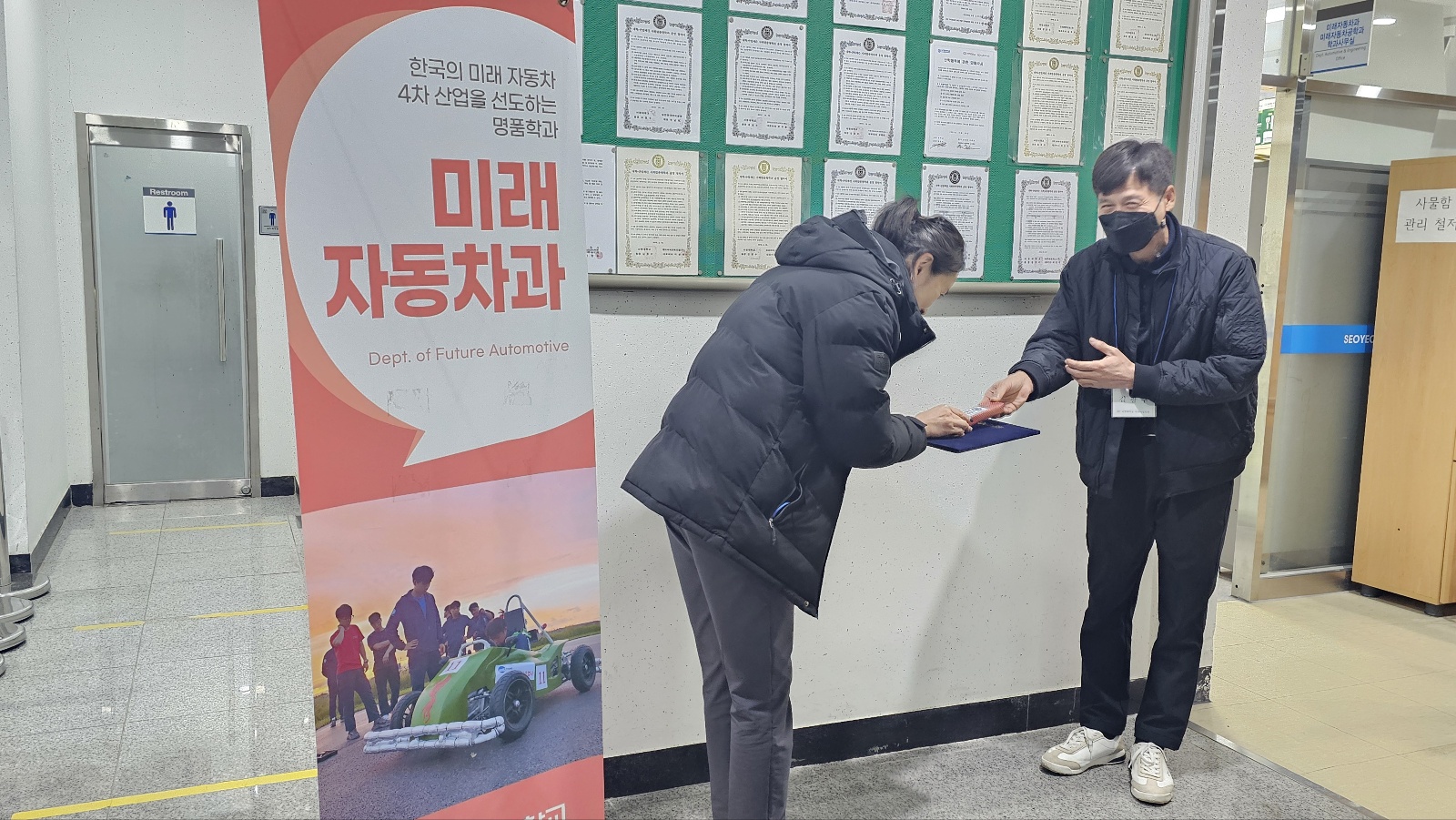미래자동차과와 산학협력을 체결하고 지속적인 교류를 하고 있는 고양/파주 현대자동차 블루핸즈 협의회에서 장학금을 지원해 주셔서 학생들에게 장학금을 전달하였습니다. 장학금은 3학년 조 * 선 학생에게는 100만원, 1학년 김 * 영, 3학년 심 * 보 학생은 각각 50만원씩 "현대자동차 블루핸즈 지축점" 김 * 수 대표님께서 전달해 주셨습니다. 장학금은 학기 중 성실히 학교생활을 하고 다른 학생들의 모범이 되는 재학생들 중에서 교수님들의 추천과 투표를 통해 선발되었습니다. 이와같이 서영대학교 미래자동차과는 다양한 장학금이 매 학기 지급되고 있습니다. 23년도에만 벌써 10명의 학생들이 학과 산업체 장학금 지급을 받았습니다. 서영대학교 미래자동차과는 서울 북부, 고양, 김포, 파주 인근 지역에서 가장 선두적인 경쟁력을 갖고 있는 학과로 최고의 시설 보유 ! 최정예 교수진 운영 ! 그리고 꿈과 열정이 넘쳐 "재미있게 놀면서 제대로 공부할 수 있는 학과"입니다.
