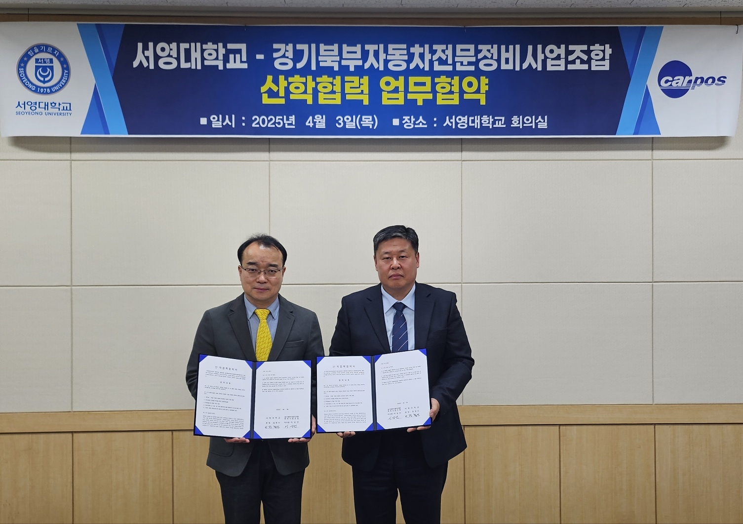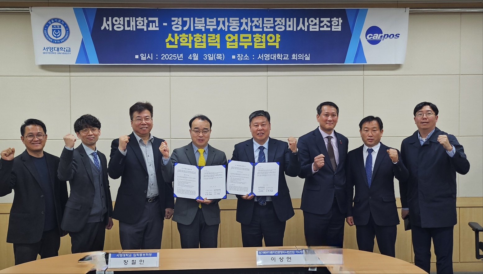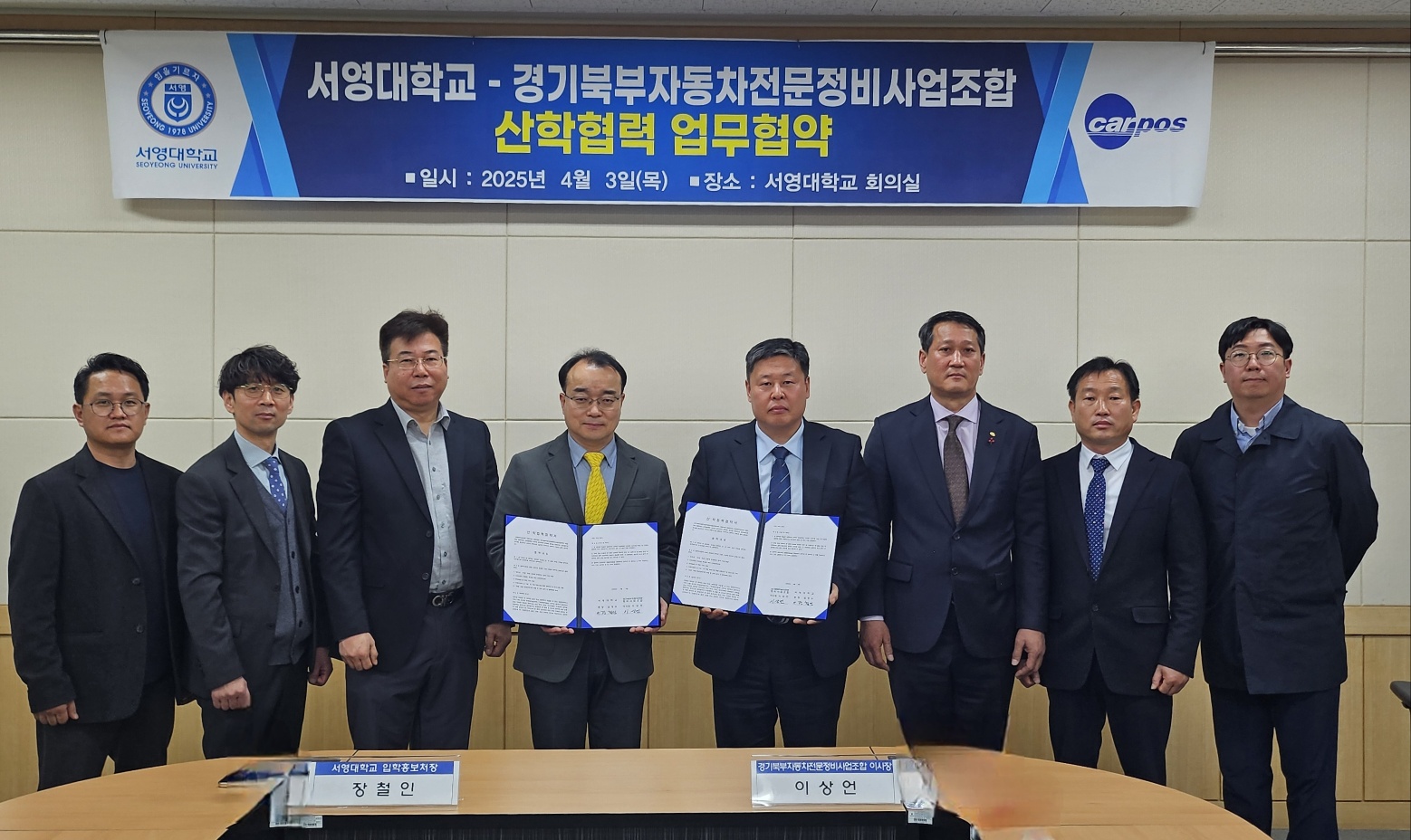 서영대학교 미래자동차과는 4월 3일(목) 경기북부자동차전문정비사업조합과 산학협약을 체결하고 미래 자동차 분야의 우수 인재 양성을 위한 협력 관계를 구축하였습니다. 서영대학교 회의실에서 진행된 업무 협약식에는 경기북부자동차전문정비사업조합 이*언 이사장님을 비롯하여 수석 부이사장민, 부이사장님 등 관계자 분들이 참석해 자리를 빛내주셨습니다. 서영대학교에서는 장*인 입학홍보처장님, 봉*준 산학협력부단장님, 미래자동차과 송*현 학과장님, 김*태 교수님께서 참석하여 자리를 함께했습니다. 이번 협약을 통해 양 기관은