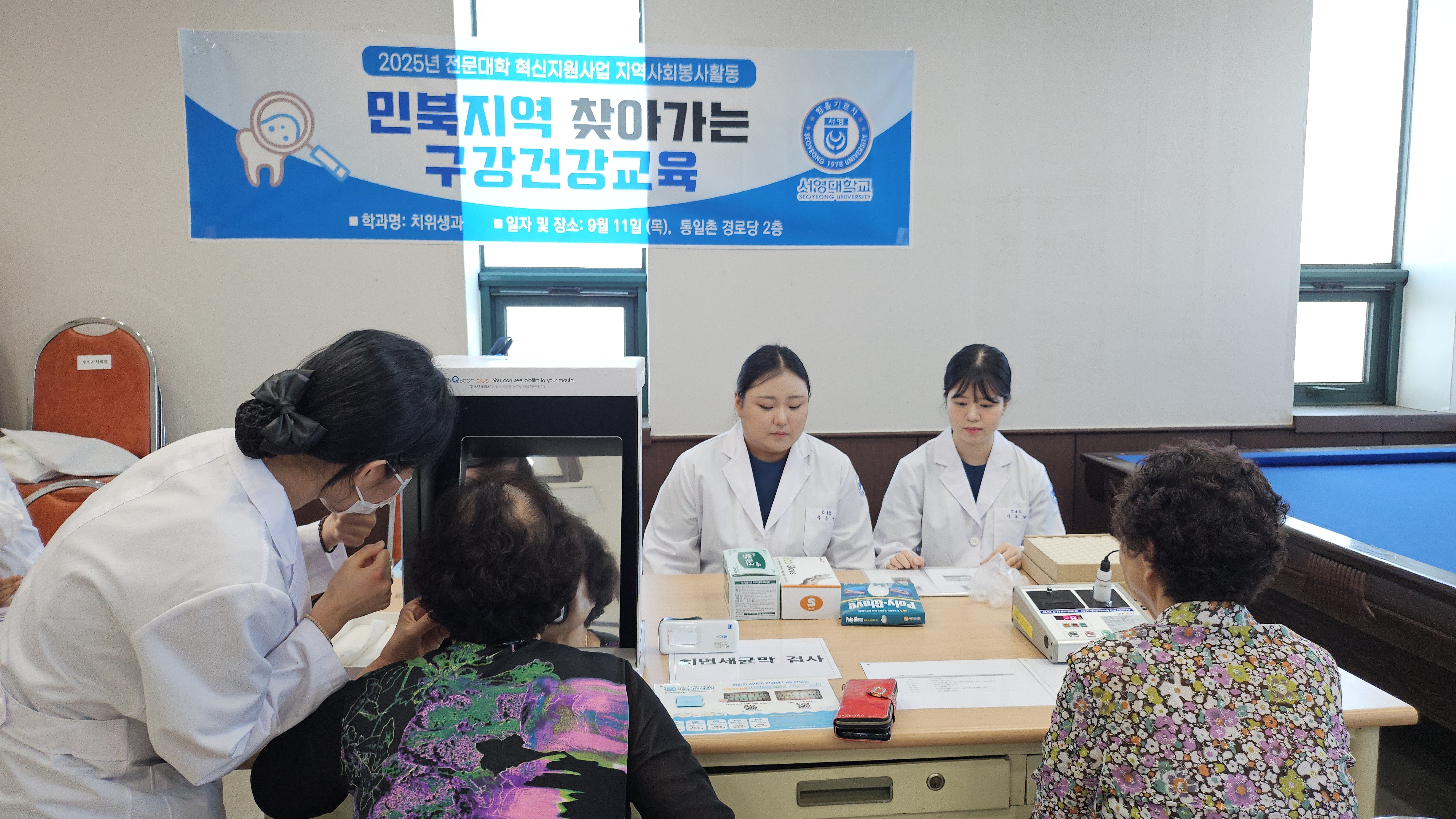 1. 일시: 2025.9.11.(목)2. 장소: 통일촌3. 내용: 노인 구강건강보견교육, Qray를 활용한 구강 내 세균검사, 구강관리용품 사용법 교육, 구취검사