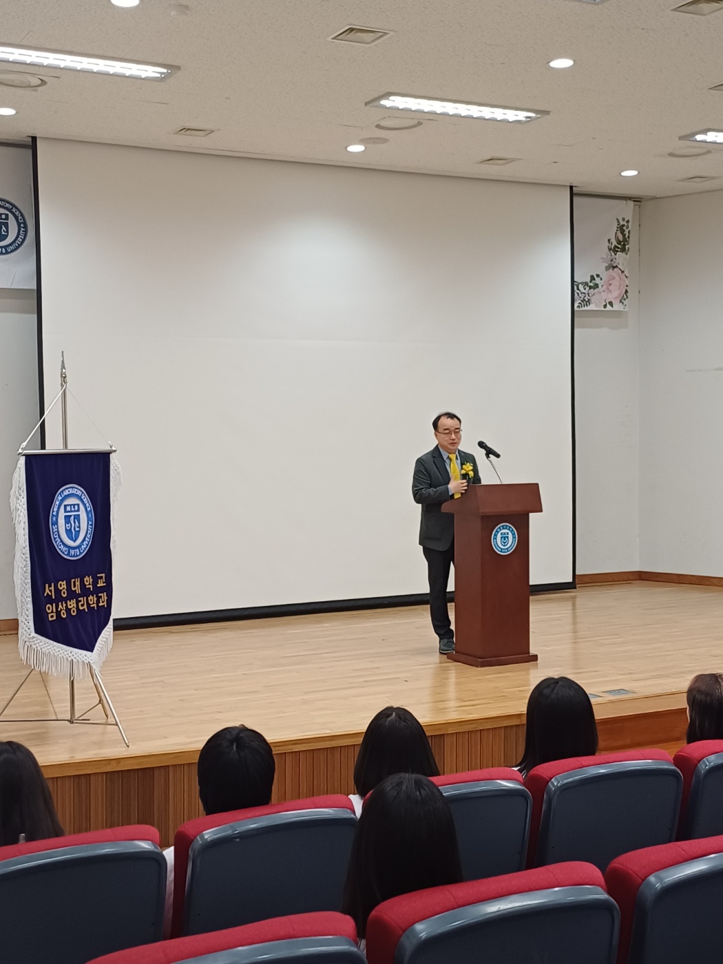 화이트 가운 수여식 이후에는 채희영 회장님께서 임상병리사의 진로와 다양한 진출 분야, 미래 비전에 대해 특강을 진행했다. 특히 채혈 실습의 중요성을 강조하며, “학교에서 기본기를 탄탄히 다져야 현장에서 경쟁력을 갖출 수 있다.”고 조언을 아끼지 않았다.