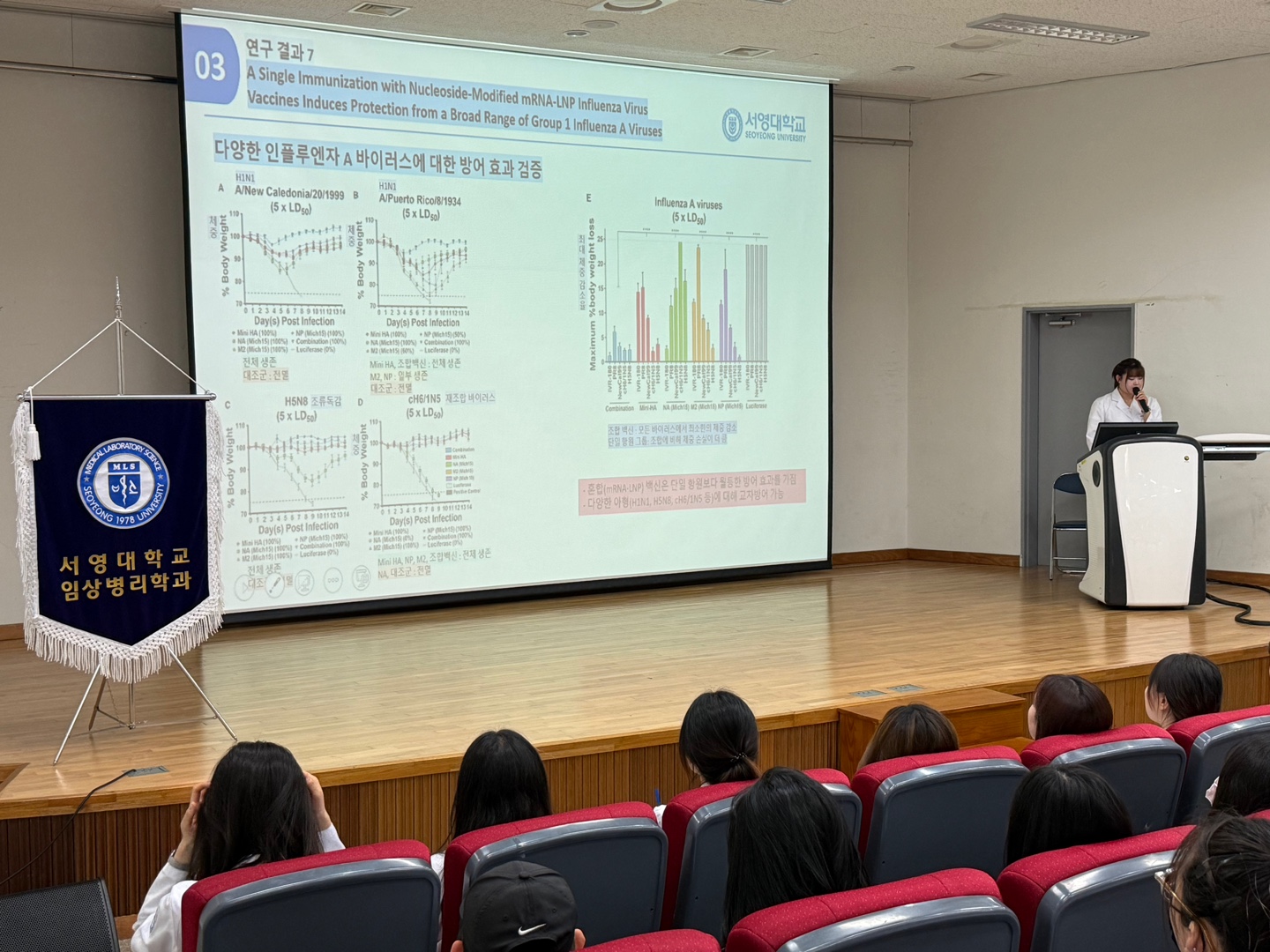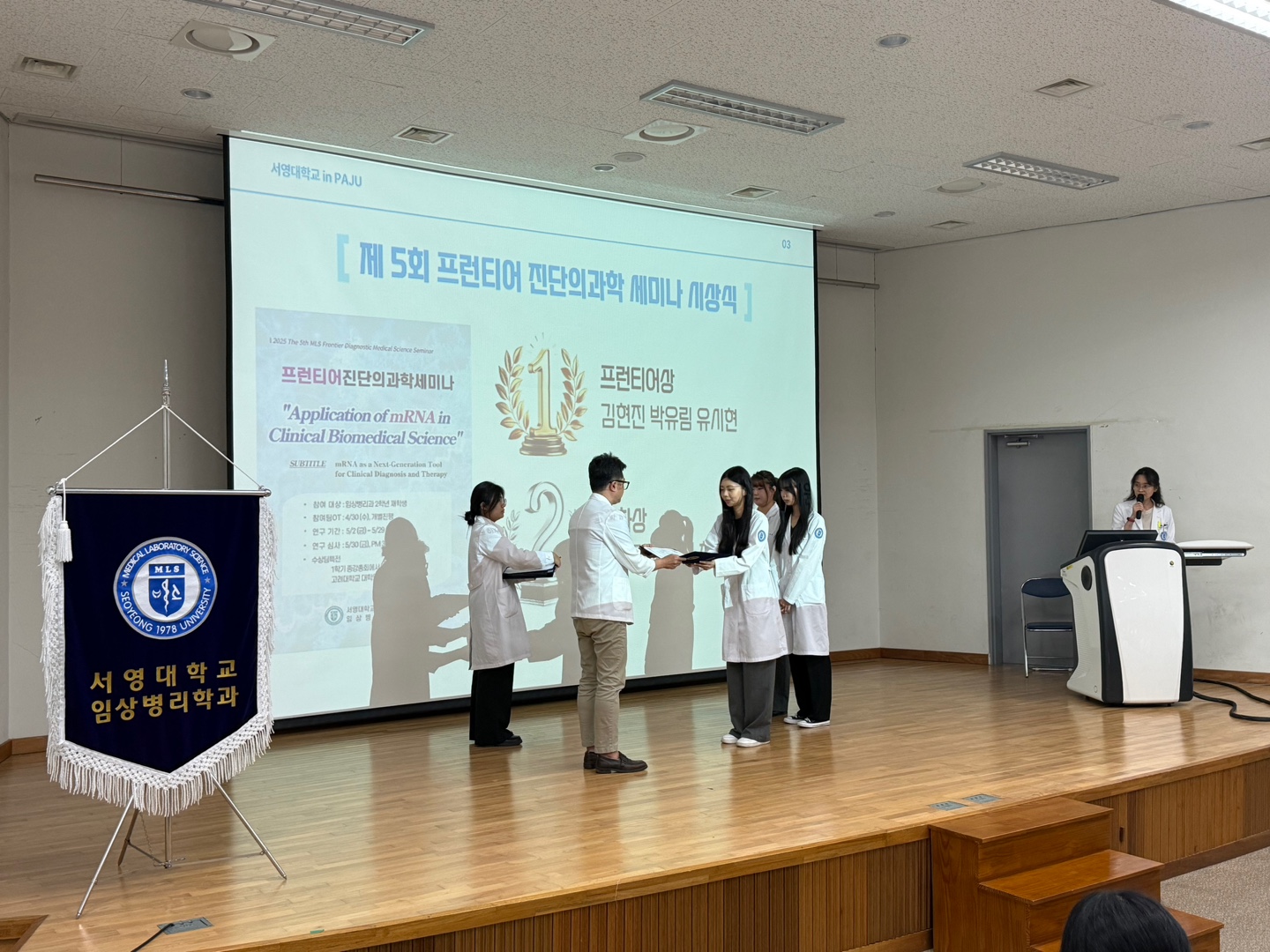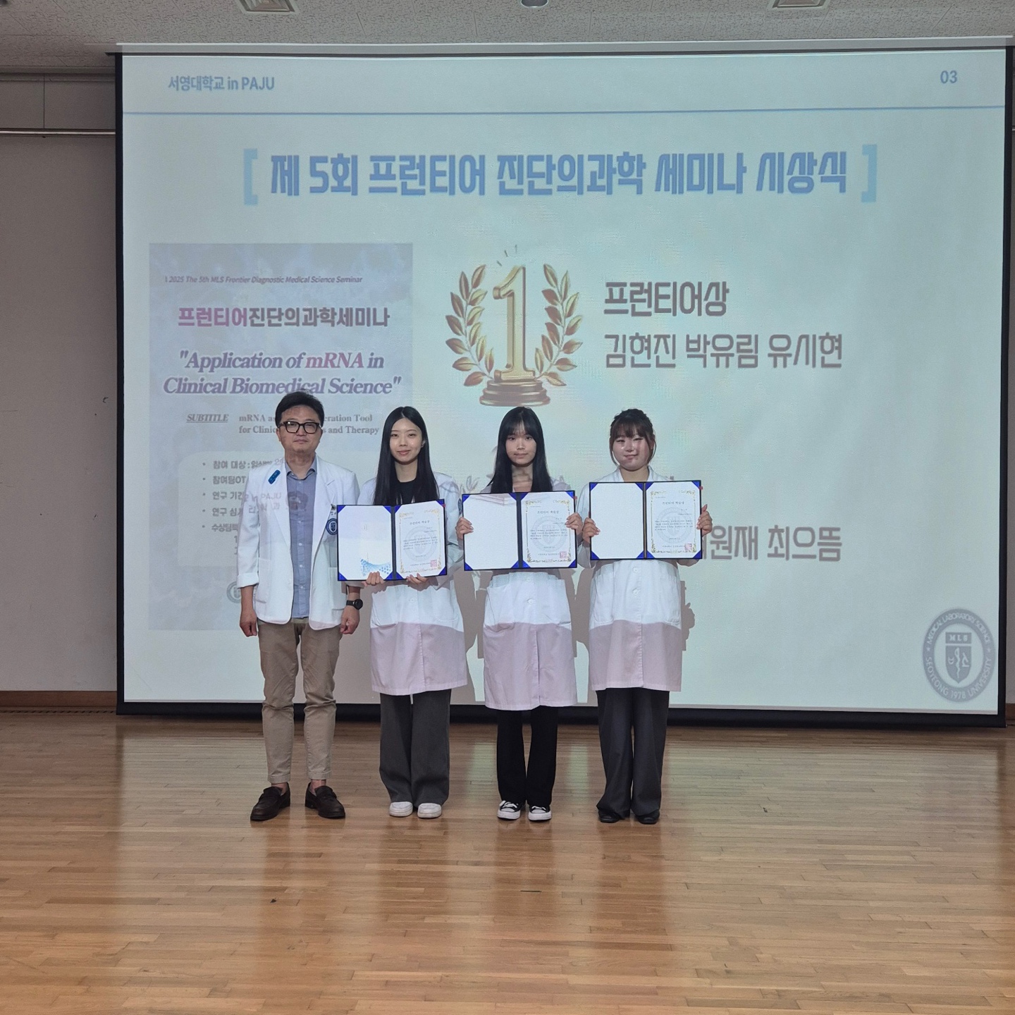 이번 종강 총회에서는 제 5회 프런티어진단의과학세미나에서 최고 점수를 획득한 24학번 김O진, 박O림, 유O현학생의 "프런티어상" 상장과 상금이 수여되었고, 한 달 간의 대학원 인턴십 참여 기회도 제공되었다.