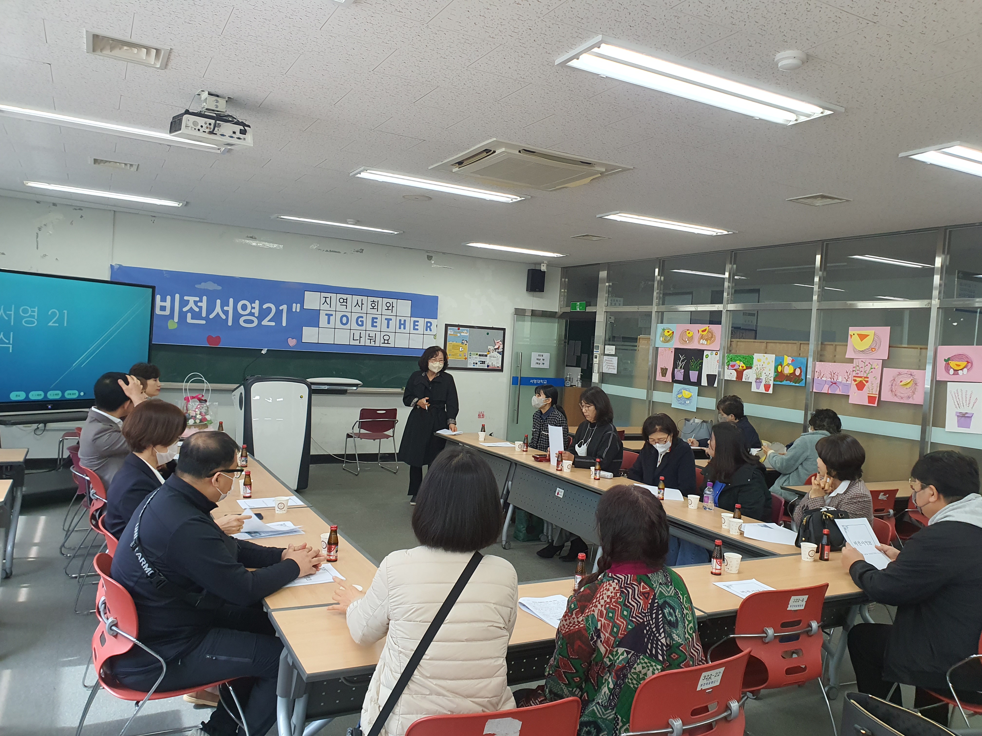 사회복지행정학과는 “서영비전21” 지역사회와 TOGETHER 나눠요 자원봉사활동 프로그램 일환으로 2023년 3월 18일(토) 발대식을 가졌다. ‘서영비전21’는 서영대학교 사회복지행정과 21학번 졸업생들을 대상으로 구성되어 발대식 및 지역사회와 TOGETHER 나눠요 자원봉사활동 프로그램의 시작을 알렸다. 이날 발대식에서는자원봉사활동의 목적, 조직구성, 활동 계획을 공유하는 시간을 가졌다. 이날 파주시운정종합복지관 이정호 관장님이 참석하여 ‘서영비전21’의 발대식 축하인사를 전했다. 파주시운정종합복지관과 서영비전21이 다양하고 폭넓은 자원봉사 활동을 통해 함께 이웃사랑을 실천할 수 있는 기회가 될 것이다. 이번 발대식을 시작으로 “서영비전21‘ 봉사단은 미술치료 상담 프로그램, 취미·여가 프로그램에 대한 전문적인 이론 교육을 토대로 자원봉사 프로그램을 개발과 더불어 다양한 재능기부 봉사활동을 전개할 예정이다.