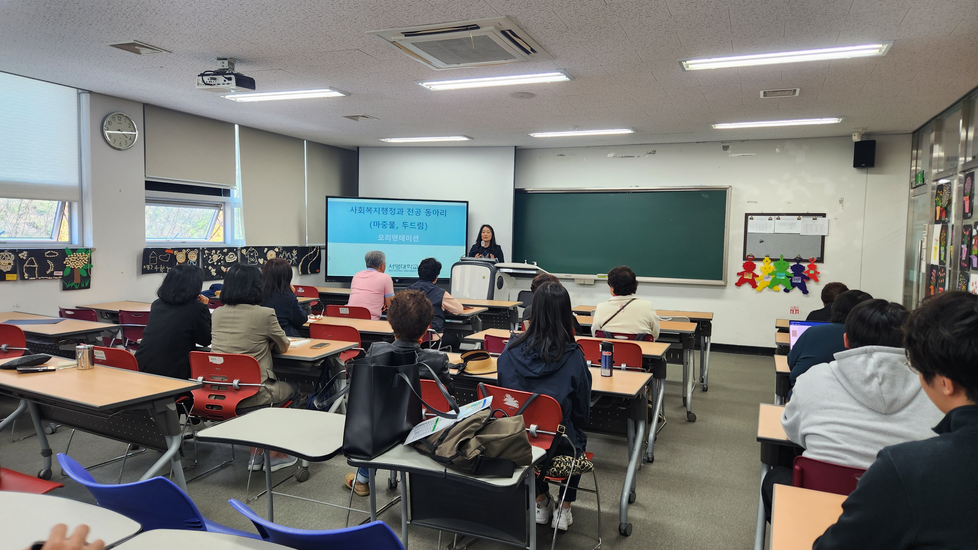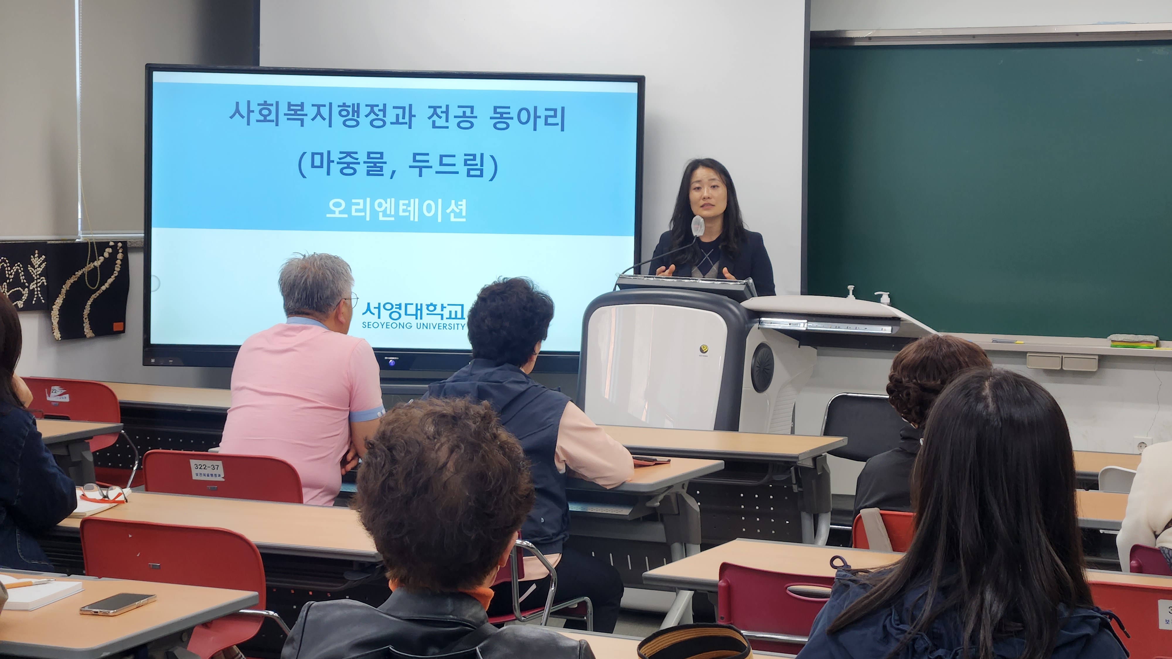 지난 4월 11일 목요일에 저희 사회복지행정과 전공동아리인 마중물과 두드림의 오리엔테이션을 진행되었습니다! 24년도 신입부원으로 약 40명의 학생분들이 가입해주셔서 더욱 뜻 깊은 시간이 되었습니다. 오리엔테이션에서는 각 동아리의 담당 교수님이신 권지혜교수님과 김민철교수님께서 동아리 소개 및 활동 안내를 진행하였습니다. 각 동아리의 이번년도 부장을 맡으신 마중물의 탁은희 학우님과 두드림의 김규태 학우님의 인사를 진행하였습니다.