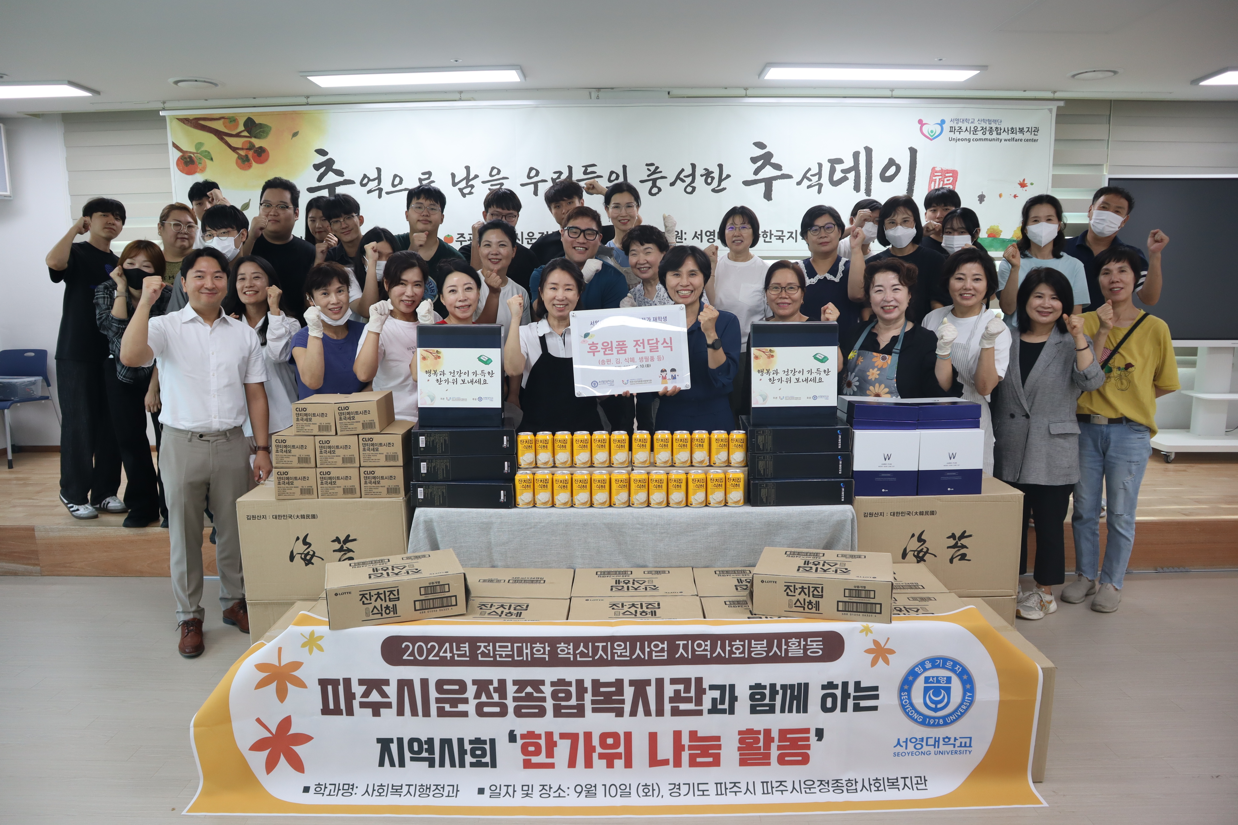 2024년 9월 10일(화) 서영대학교 사회복지행정과 학생들이 파주시운정종합복지관과 함께 하는 지역사회 " 한가위 나눔 활동"을 진행하였습니다.