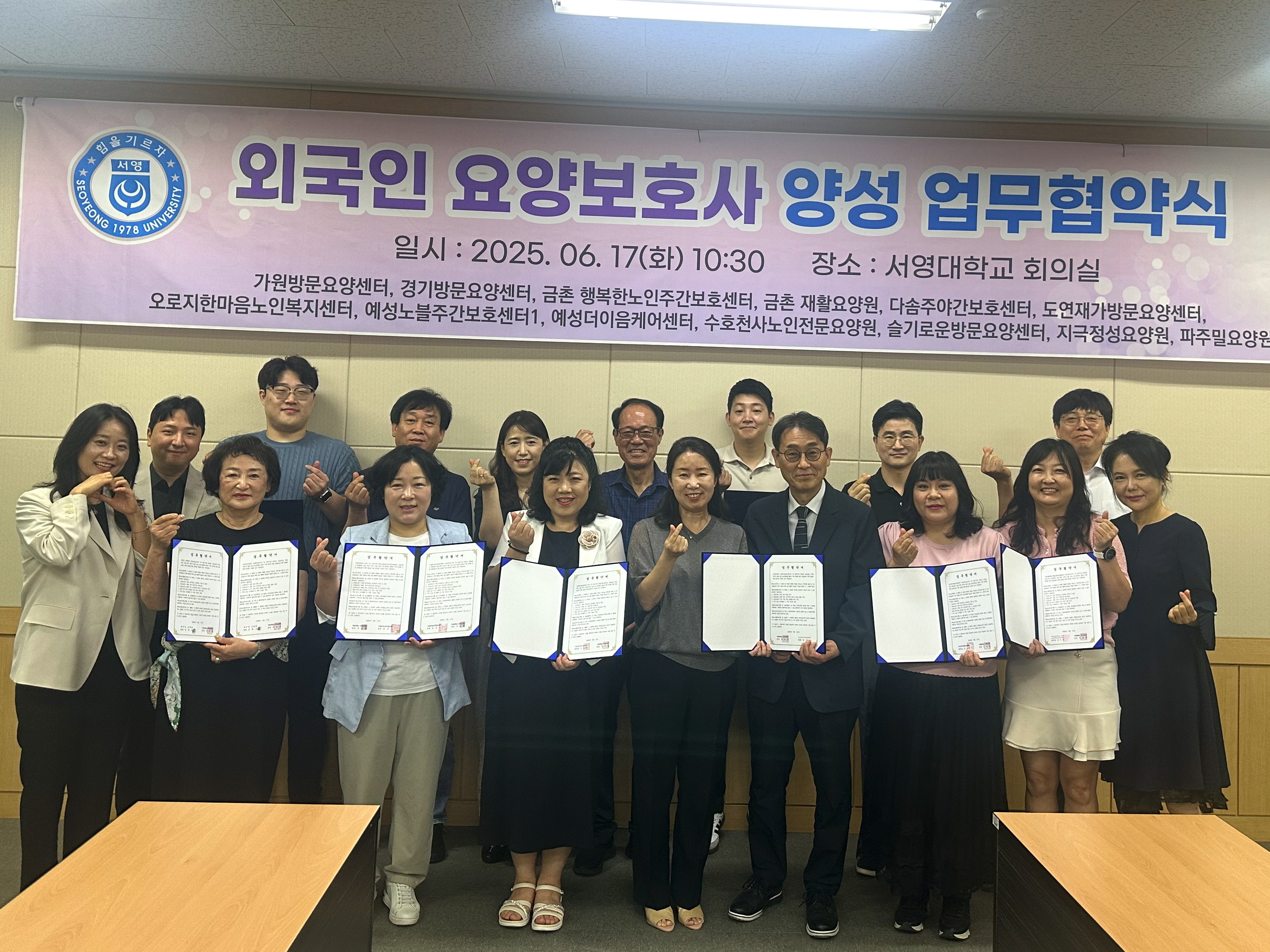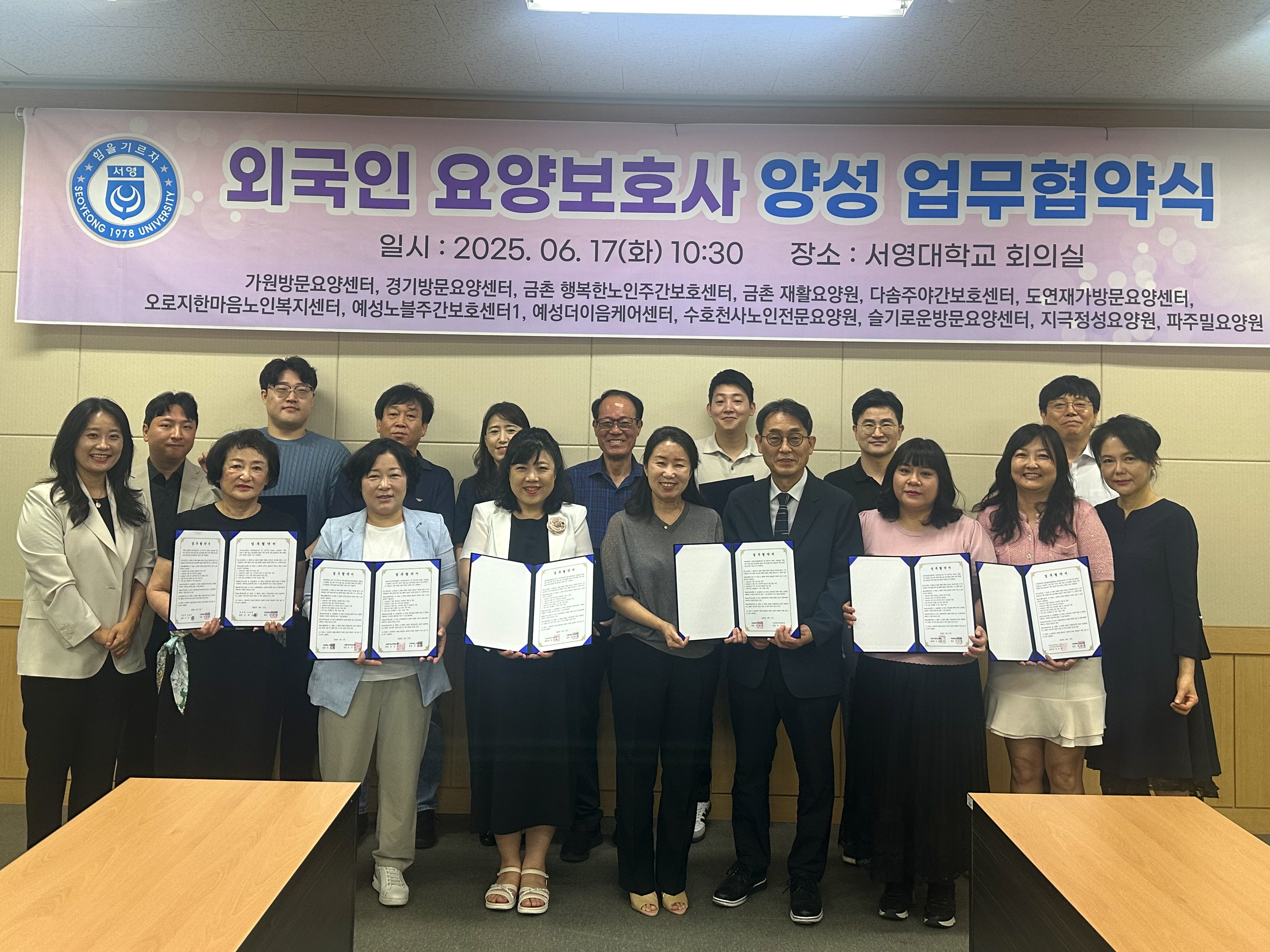 ○ 서영대학교(총장 김정수) 국제교육원(원장 주승완)은 경기지역 노인요양기관과 외국인 요양보호사 양성을 위한 MOU를 체결하였다. 2025년 6월 17(서영대학교 회의실에서 진행된 협약식에는 서영대학교 국제교육원 박용환 부원장사회복지행정과 김효선 학과장 외 사회복지행정과 학과교수 등 학교관계자와 가원방문요양센터 김경림 센터장다솜주야간보호센터 우근제 센터장 등 경기지역 노인요양기관 13곳의 기관 관계자들이 참석하였다.