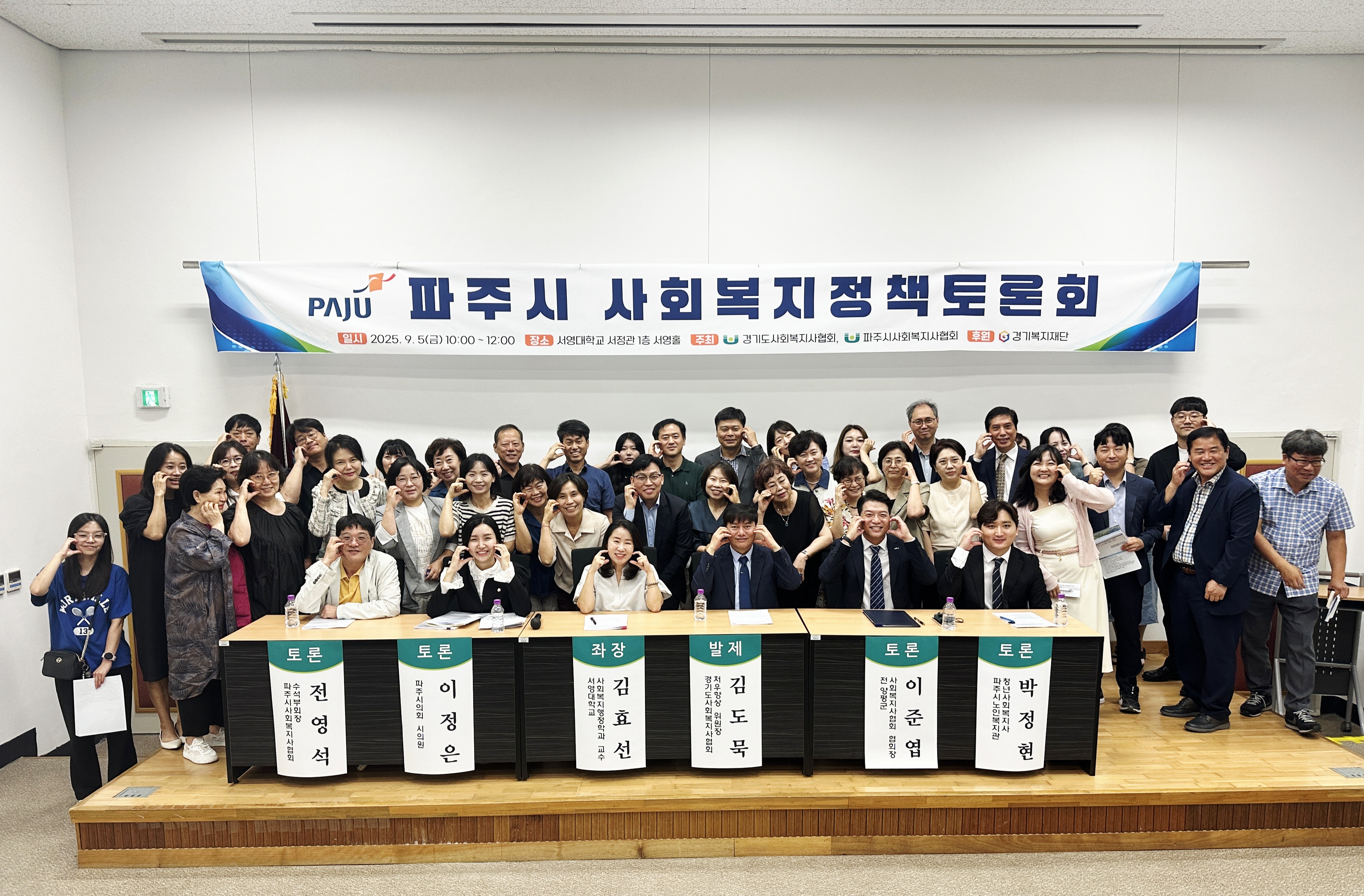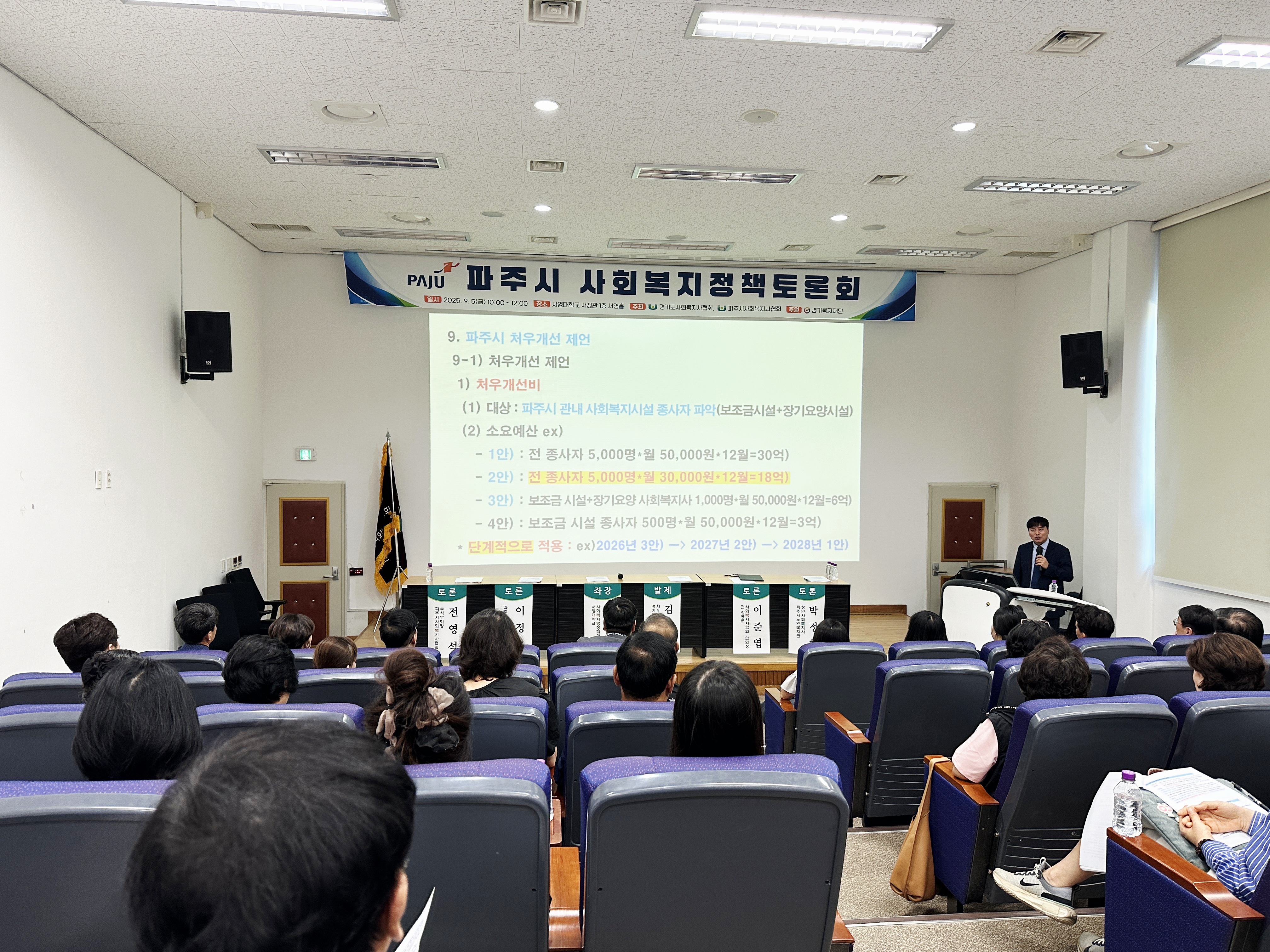 지난 9월5일(금) 서영대학교 서영홀에서 ‘파주시 사회복지사 등의 처우개선을 위한 제언’ 이라는 주제로 파주시 사회복지정책토론회가 개최되었다. 이번 토론회는 사회복지사의 처우 개선과 제도적 지원 확대를 주제로, 현장의 목소리를 정책에 반영하고 지역 실정에 맞는 맞춤형 방안을 모색하기 위해 마련됐으며, 경기도사회복지사협회장, 파주시사회복지협회장, 파주시 복지정책과를 비롯한 관계 기관 및 단체 관계자 70여 명이 참석한 가운데 진행됐다. 경기도사회복지사협회 처우향상위원장인 김도묵이사장의 발제에 이어 사회복지행정과 김효선학과장이 좌장으로 토론회를 진행하였으며, 박정현 청년사회복지사, 이준엽 전 양평군사회복지사협회협회장, 전영석 파주시사회복지사협회 수석부회장, 이정은 파주시의원이 토론자로 참여하여 여러 가지 정책을 제시하였다.
