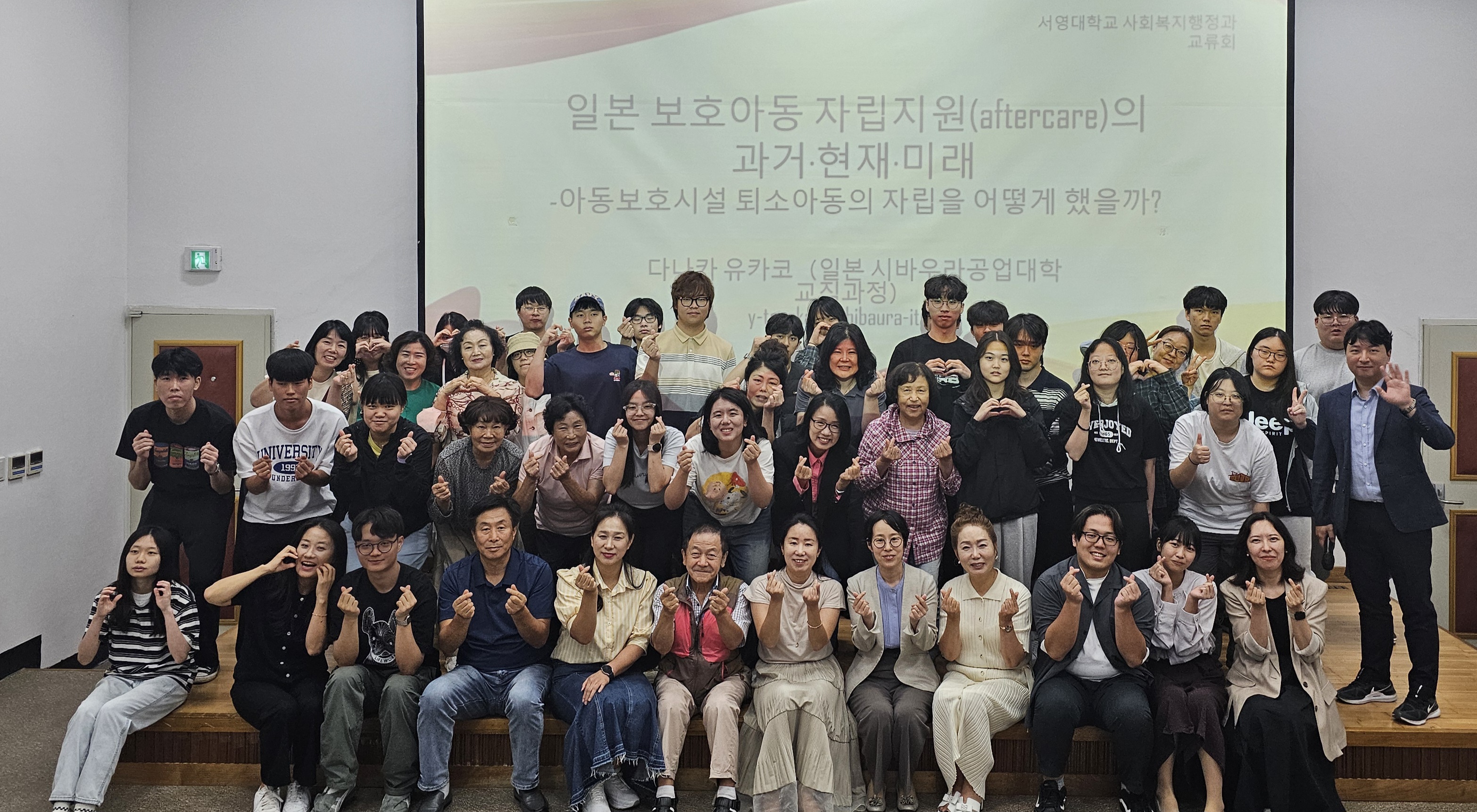 교류 행사에는 서영대학교 사회복지행정과 교수님들과 1~4학년 재학생 약 70여명이 참석하였습니다. 다나카 교수님은 ‘일본 보호아동 자립지원(Aftercare)의 과거·현재·미래’라는 주제로 특강을 진행해 주셨습니다.