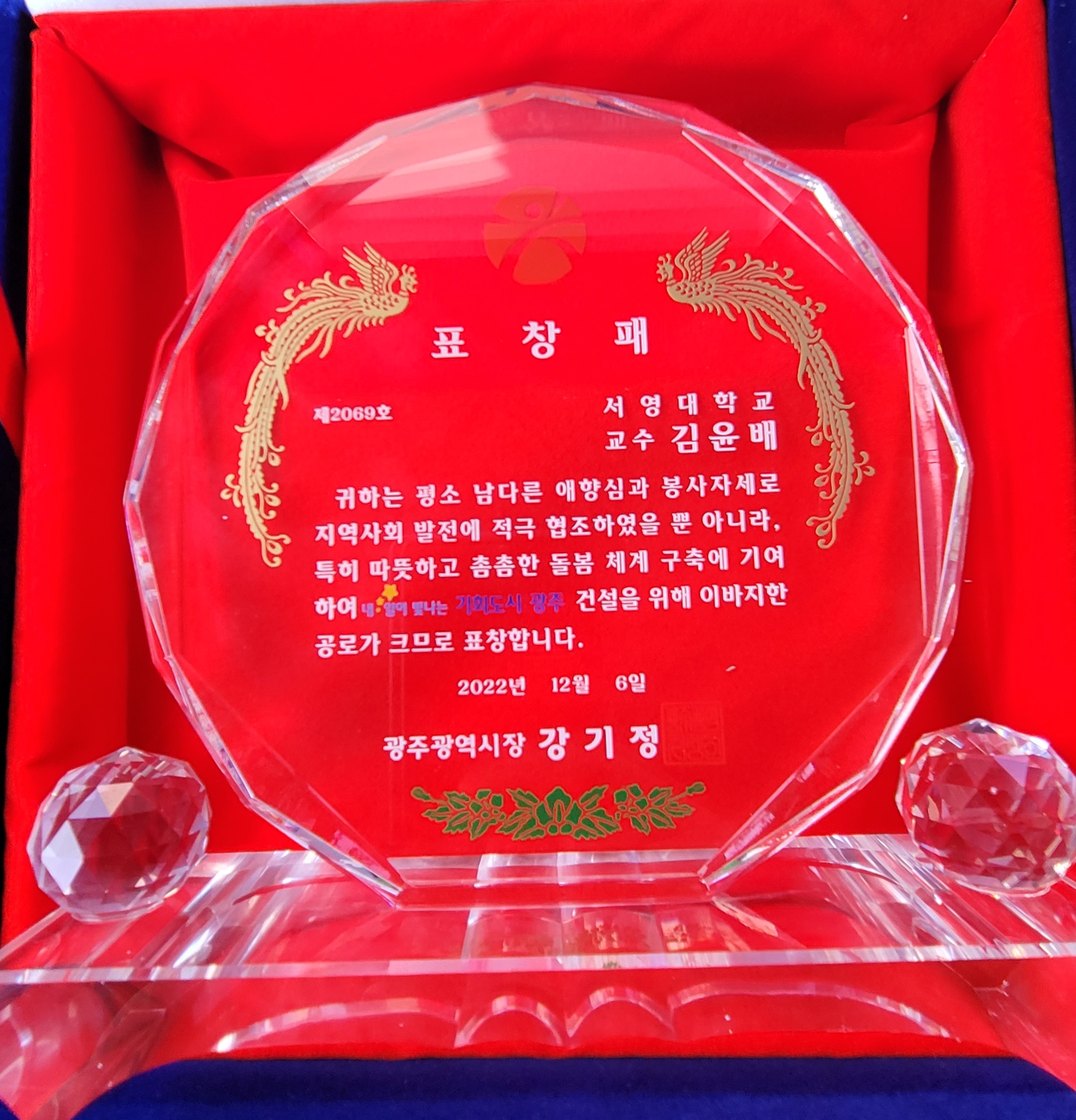 12월6일 화요일 광주시에서 저희 사회복지과 전임교수님인 김윤배 교수님께서 지역돌봄에 공헌한 공로를 인정받으셔서 <표창장>을 수여하셨습니다. 더불어 저희 심화반 수업을 하고 계시는 박종민 교수님께서도 함께 상을 받으셨습니다.