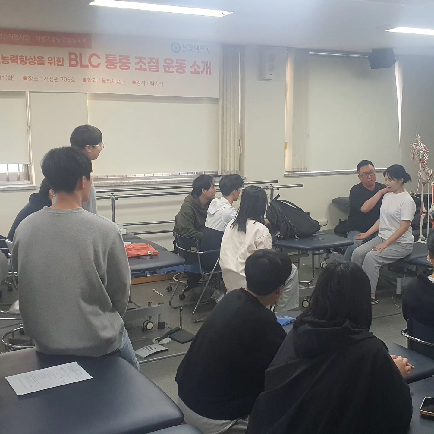 BLC 밸런스운동센터 백승석 센터장님께서 저희 물리치료과 2,3학년 학생들을 대상으로 통증을 감소시키는 운동법들에 대해 실무중심 강의를 진행해주셨습니다