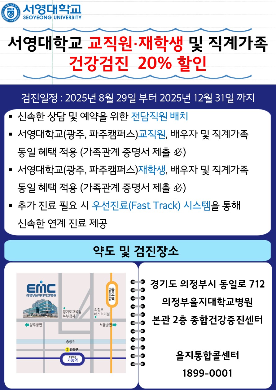 O. 협약서의 주요내용은 다음과 같다. ▲간호교육 분야와 간호사 실무 교육 협력 각 기관의 보유자원 활용 및 협조 교육 인프라의 공동 활용 및 지원 서영대학교(광주, 파주캠퍼스) 교직원 · 재학생 및 직계가족 건강검진 20% 할인 (추가 진료 필요 시 우선 진료 시스템을 통한 신속한 연계 진료 제공) 등에 관한 사항이다특히 이번 협약에 따라 2025년 8월 29일부터 12월 31일까지 서영대학교 교직원·재학생 및 배우자·직계가족은 건강검진을 받을 때 20% 할인 혜택을 받을 수 있게 되었다. 또한 추가 진료 필요 시 ‘Fast Track’ 시스템을 통해 신속한 연계 진료도 제공될 예정이다.