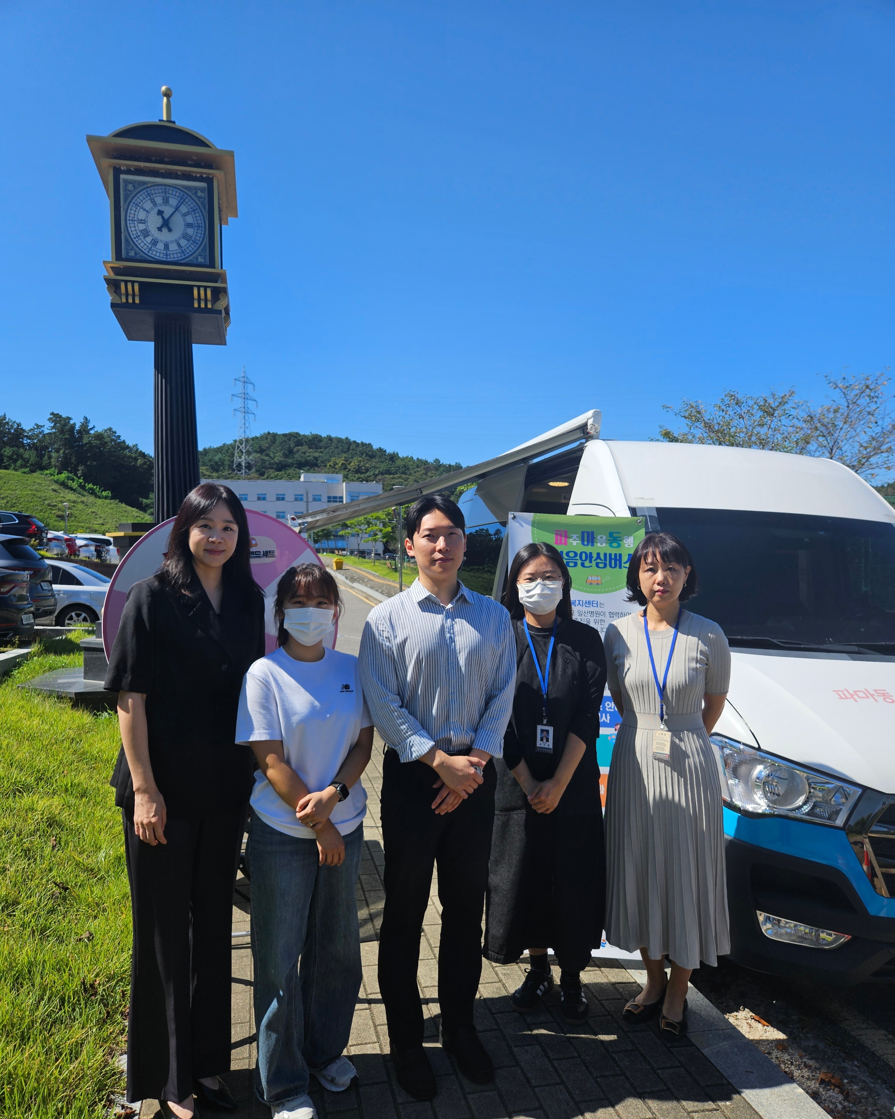 O. 우리대학(총장 김정수인권상담센터(부센터장 오민정) 파주시정신건강복지센터와 업무협의를 통해 '청년 정신건강증진을 위한 2030 파주마음동행 마음안심버스 사업'을 진행하였다. 910일(수)에 진행된 '2030 파주마음동행 마음안심버스' 사업에는 오민정 인권상담센터 부센터장, 강성민 인권상담센터 상담사, 김미정 사회복지사, 이지혜 사회복지사, 배지영 사회복지사 등 총 5명이 참석하였다.