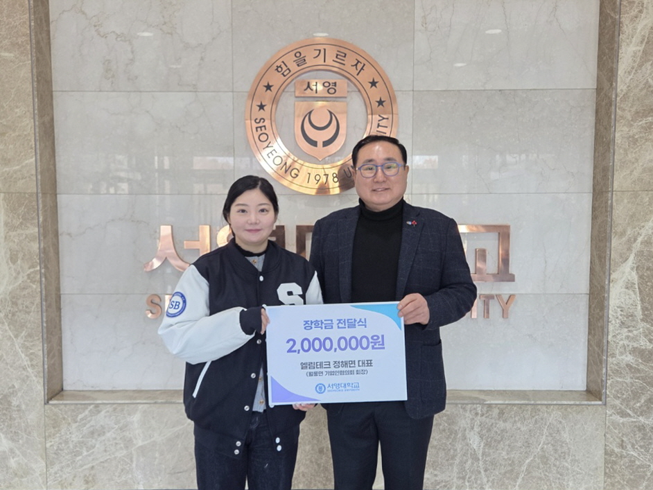 O 서영대학교(총장 김정수)는 1월 20일(화) 정해면 월롱면기업인협의회 회장(엘림테크 대표)으로부터 대학 발전과 지역사회 연계 인재 양성을 위한 장학금 200만 원을 기부받았다. 이번 기부는 지역사회와 대학 간의 협력 관계를 더욱 공고히 하며, 상생의 가치를 실현하는 뜻깊은 계기가 됐다.